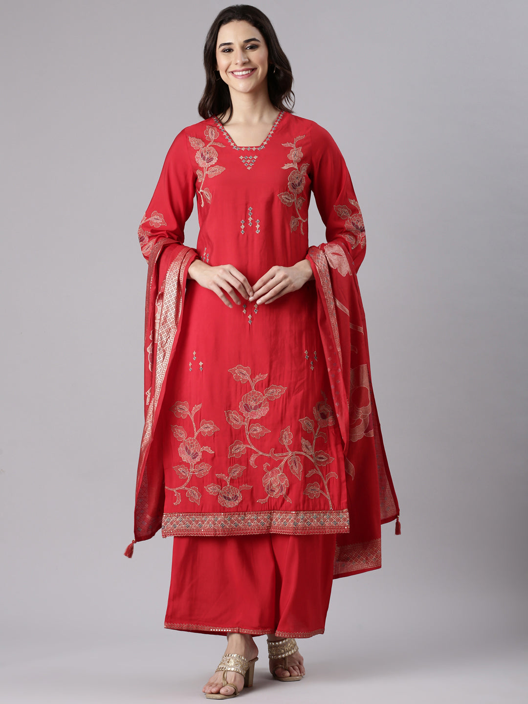 Experience timeless elegance with the Red Dola Silk Embroidered Three Piece Set. Crafted from luxurious Dola silk, this ensemble features intricate embroidery that adds refined texture and depth. Its rich red hue evokes grace and confidence, perfect for formal occasions or festive celebrations. Designed as a coordinated set, it combines style and comfort effortlessly, ensuring you make a polished statement wherever you go.
