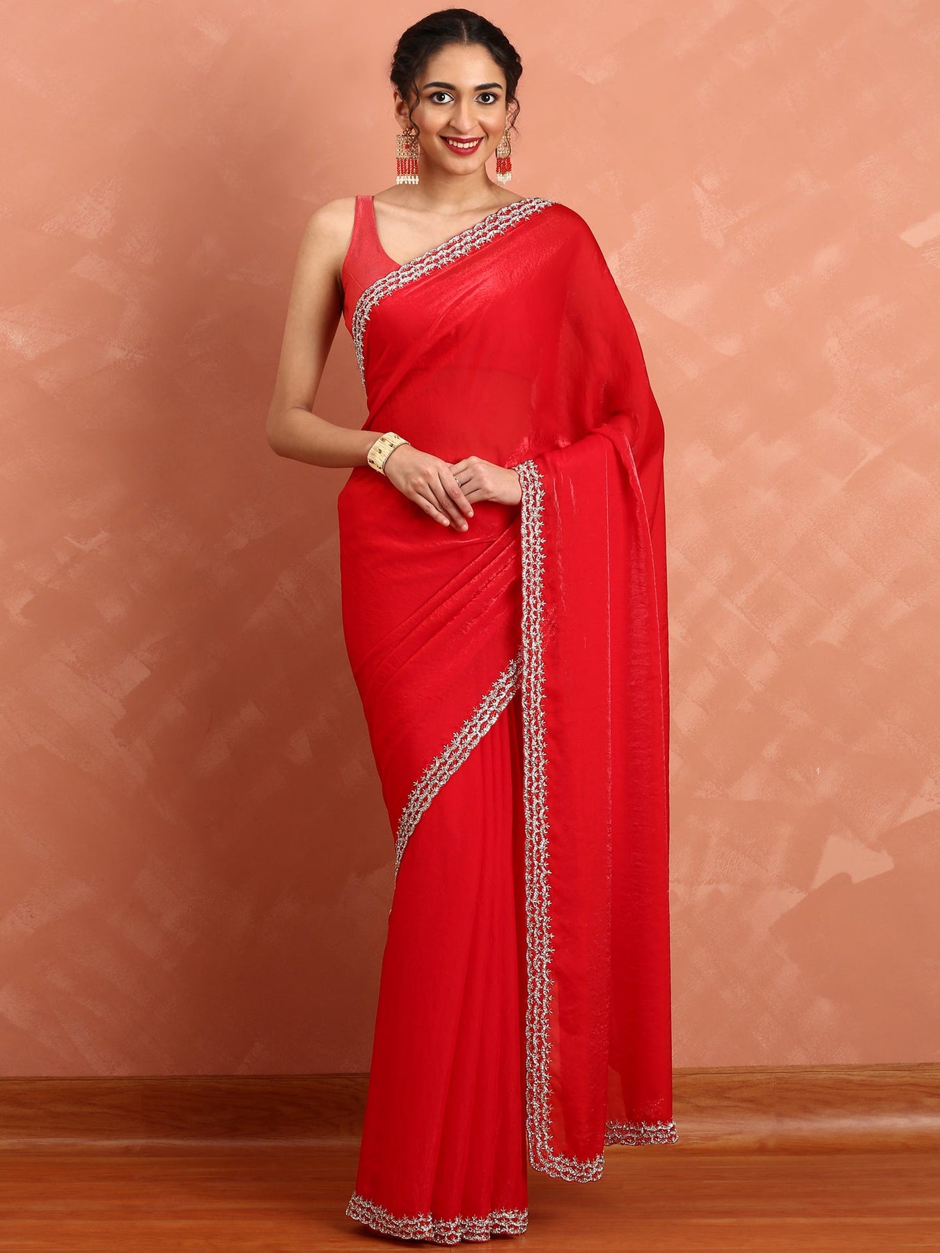 Crafted with precision, this red Jimmy saree features exquisite pearls and intricate cut Dana embroidery. The combination of these artisanal embellishments enhances the saree’s texture and depth, offering a luxurious sheen and sophisticated appeal. Ideal for formal occasions, it embodies refined elegance and showcases expert craftsmanship in traditional Indian textile artistry.