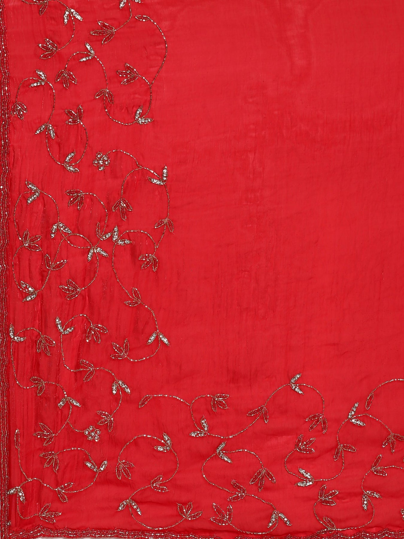 Elevate your ethnic collection with this exquisite red-pink Jimmy saree, featuring intricate cut dana and Swarovski hand embroidery. The delicate embellishments add a sophisticated sparkle, enhancing its elegant drape. Perfect for festive occasions and formal events, this saree blends traditional craftsmanship with contemporary style, ensuring a standout look with every wear.