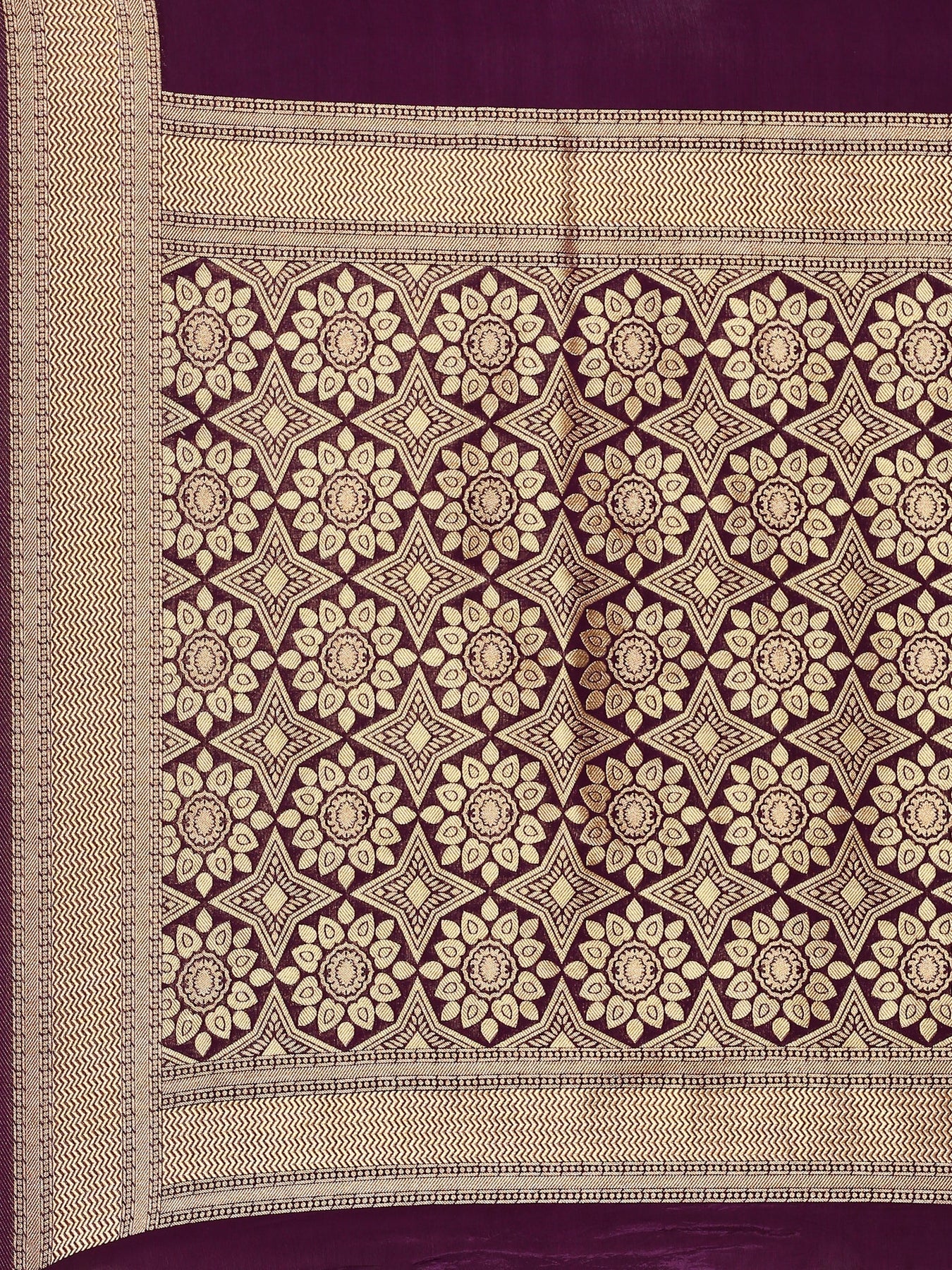This exquisite wine Banaras saree showcases traditional craftsmanship with intricate peacock motifs woven seamlessly into its fabric. Featuring a rich Zari border, the saree exudes elegance and timeless appeal, perfect for formal occasions and celebrations. The fine weaving technique highlights the detailed patterns and lustrous texture, making it a sophisticated addition to any wardrobe.