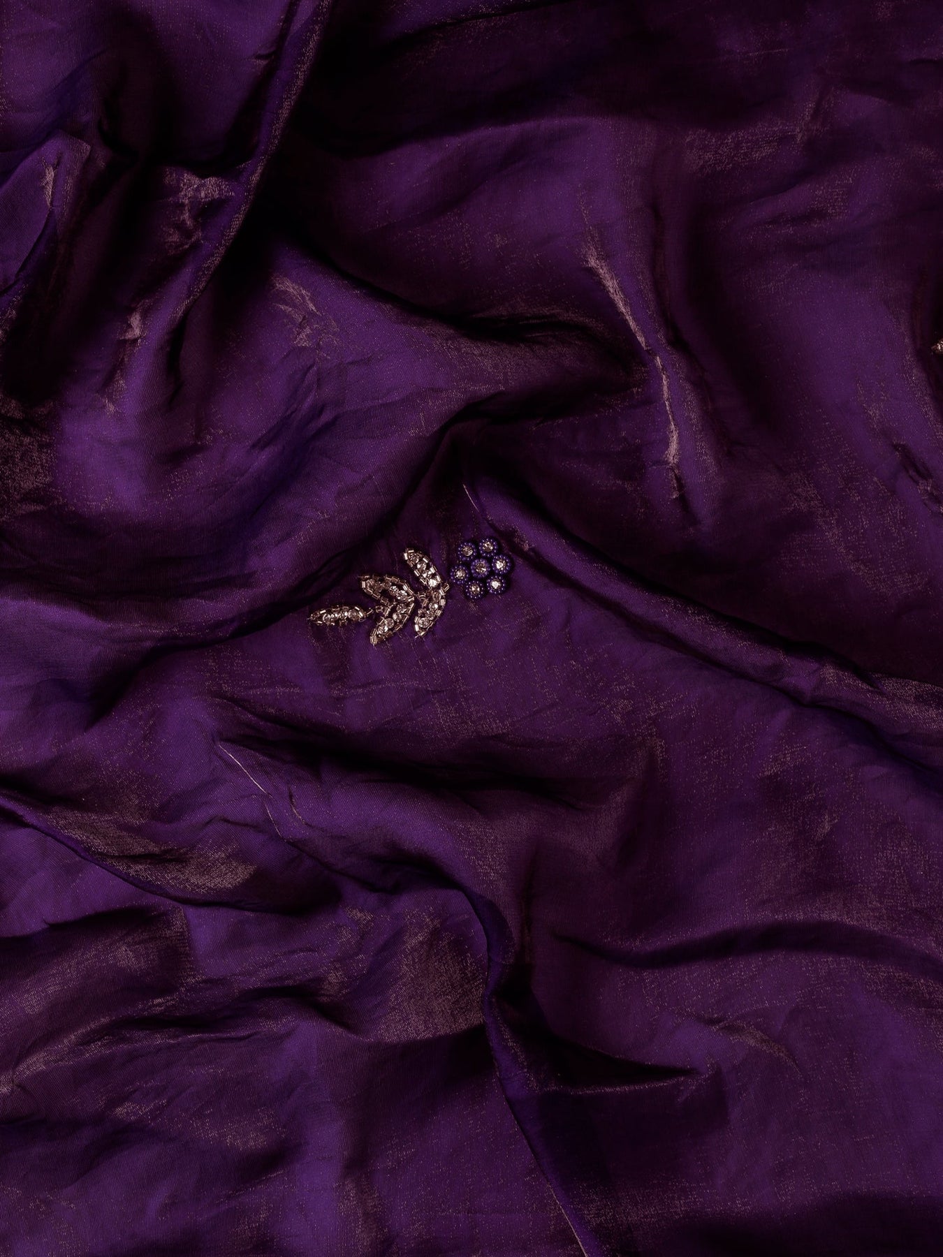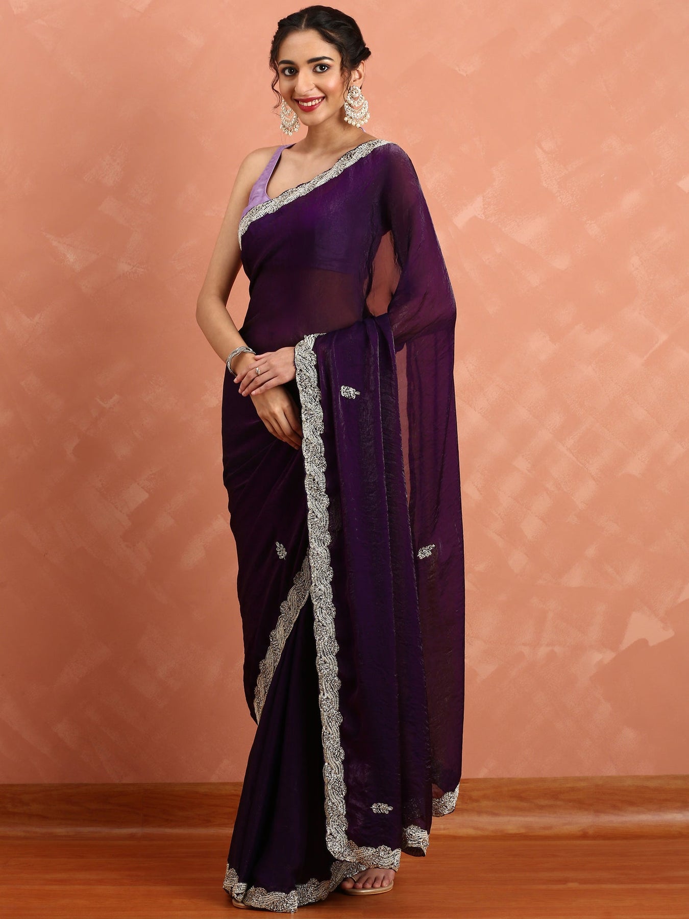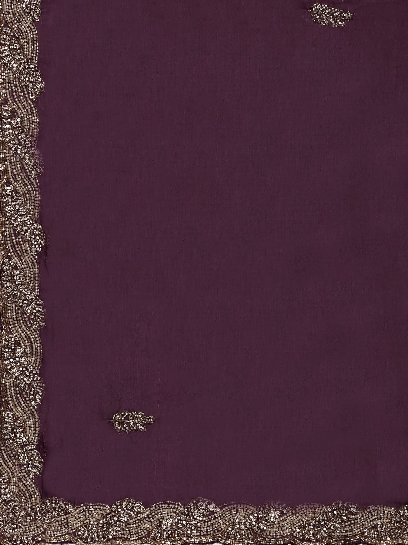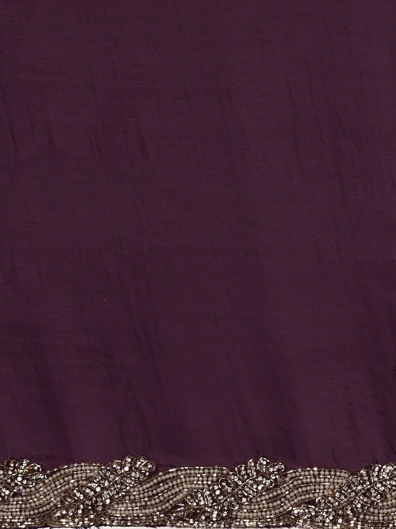 Elevate your elegance with this Wine Jimmy sheer satin saree, beautifully enhanced by delicate hand embroidery. Its lightweight, flowing fabric drapes effortlessly, making it perfect for special occasions. The rich wine hue complements any skin tone, while the intricate embroidery adds a touch of artisanal charm. Experience grace and sophistication in every step with this stunning saree.