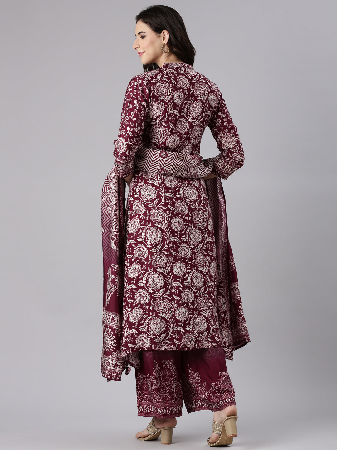 Elevate your wardrobe with this Wine Muslin Printed A-Line Three Piece Set, tailored for effortless elegance. Crafted from breathable muslin fabric, it combines comfort with refined style. The graceful A-line silhouette flatters every figure, while the coordinated three-piece ensemble offers versatile layering options. Perfect for sophisticated occasions, this set brings timeless charm and a touch of artistry to your attire.