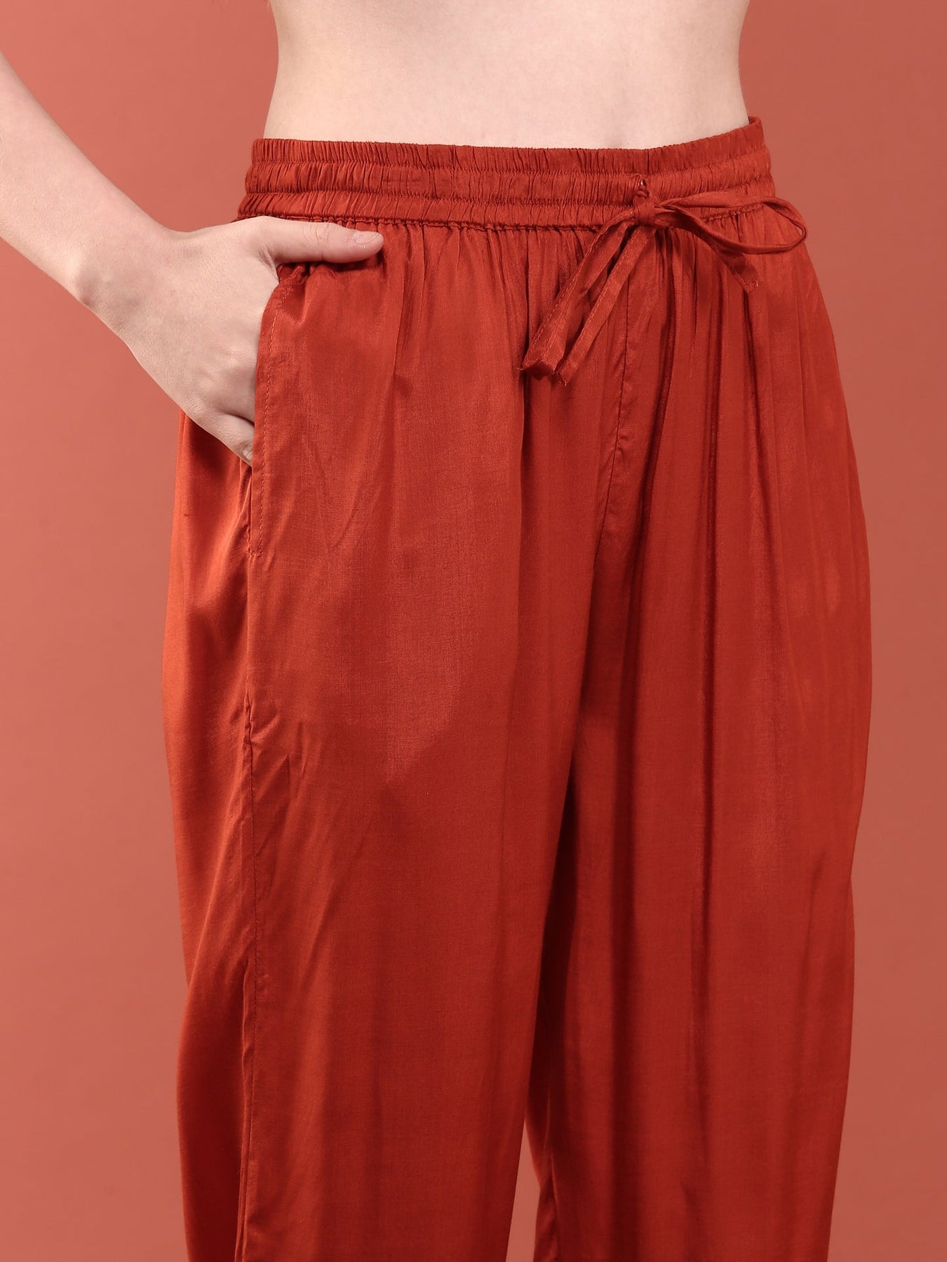 Elevate your ethnic wardrobe with this striking three-piece ensemble crafted from premium dola silk. The blunt orange hue creates a bold, sophisticated statement, while the digital print adds contemporary flair to traditional silhouettes. This versatile set seamlessly transitions from festive occasions to everyday elegance, offering comfort without compromising on style.
