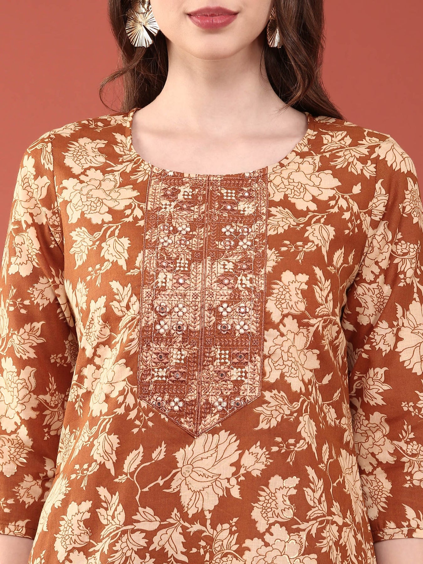 Elevate your ethnic wardrobe with this sophisticated three-piece ensemble crafted from luxurious gold modal silk. The collection features an exquisite floral digital print that seamlessly blends traditional aesthetics with contemporary design. Each piece is meticulously tailored to offer superior comfort and an elegant drape, making it ideal for festive occasions, celebrations, or refined everyday wear.