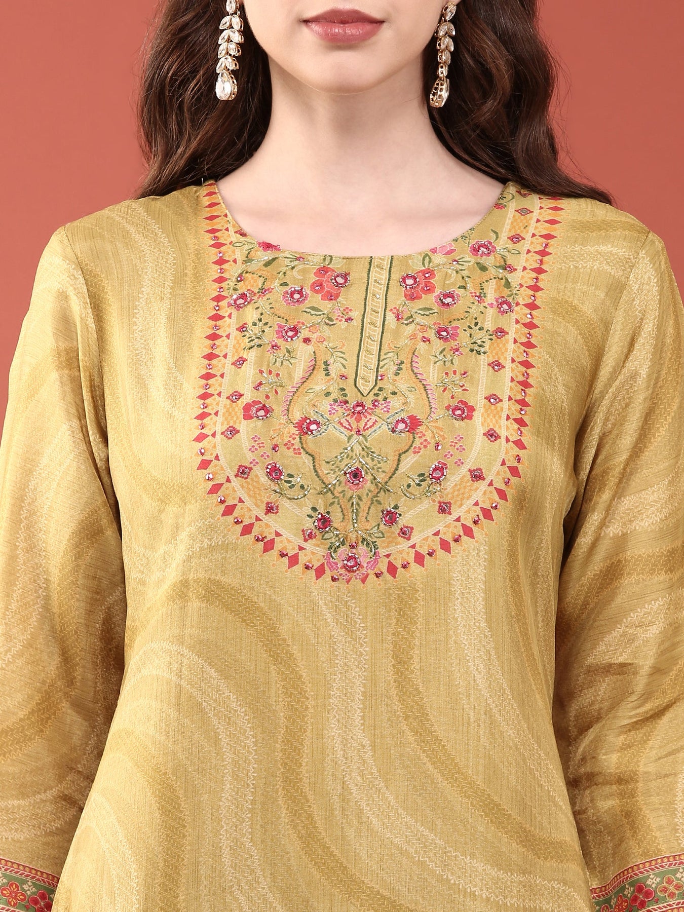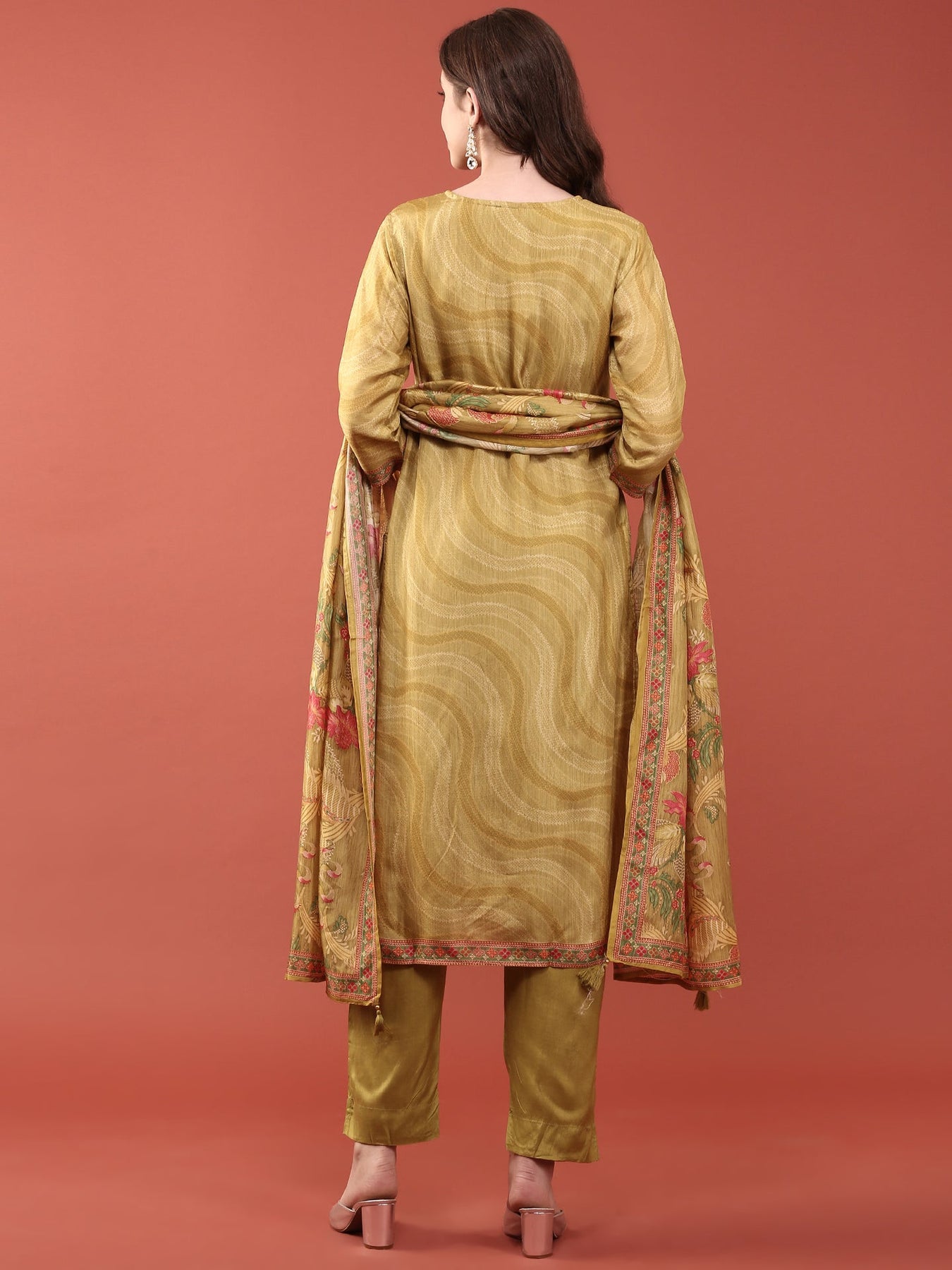 Elevate your ethnic wardrobe with this sophisticated three-piece ensemble crafted from premium dola silk. The vibrant lime green base showcases an intricate floral digital print that combines traditional aesthetics with contemporary design sensibilities. Dola silk's natural lustre and fluid drape create an elegant silhouette, while the digital printing technique ensures crisp, detailed patterns that resist fading.