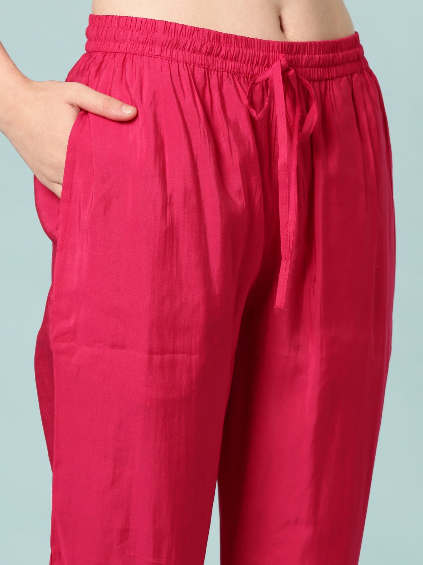 Elevate your ethnic wardrobe with this stunning magenta three-piece set crafted from luxurious dola silk. The vibrant digital print adds contemporary flair to traditional styling, making it perfect for festive occasions, celebrations, or everyday elegance. This versatile ensemble combines comfort with sophistication, allowing you to express your personal style with confidence. The rich magenta hue complements various skin tones beautifully, while the premium silk fabric ensures a graceful drape and lasting quality. Ideal for those who appreciate the perfect blend of modern design and timeless tradition.