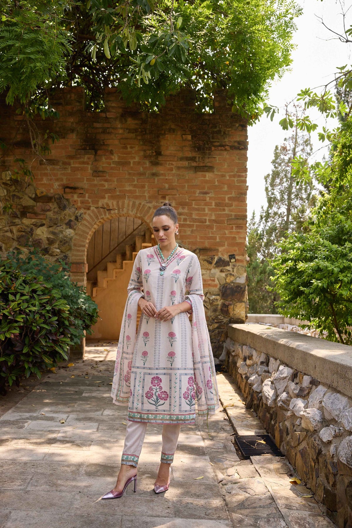 Neerus Beige Printed Straight Kurta and Trousers With Dupatta