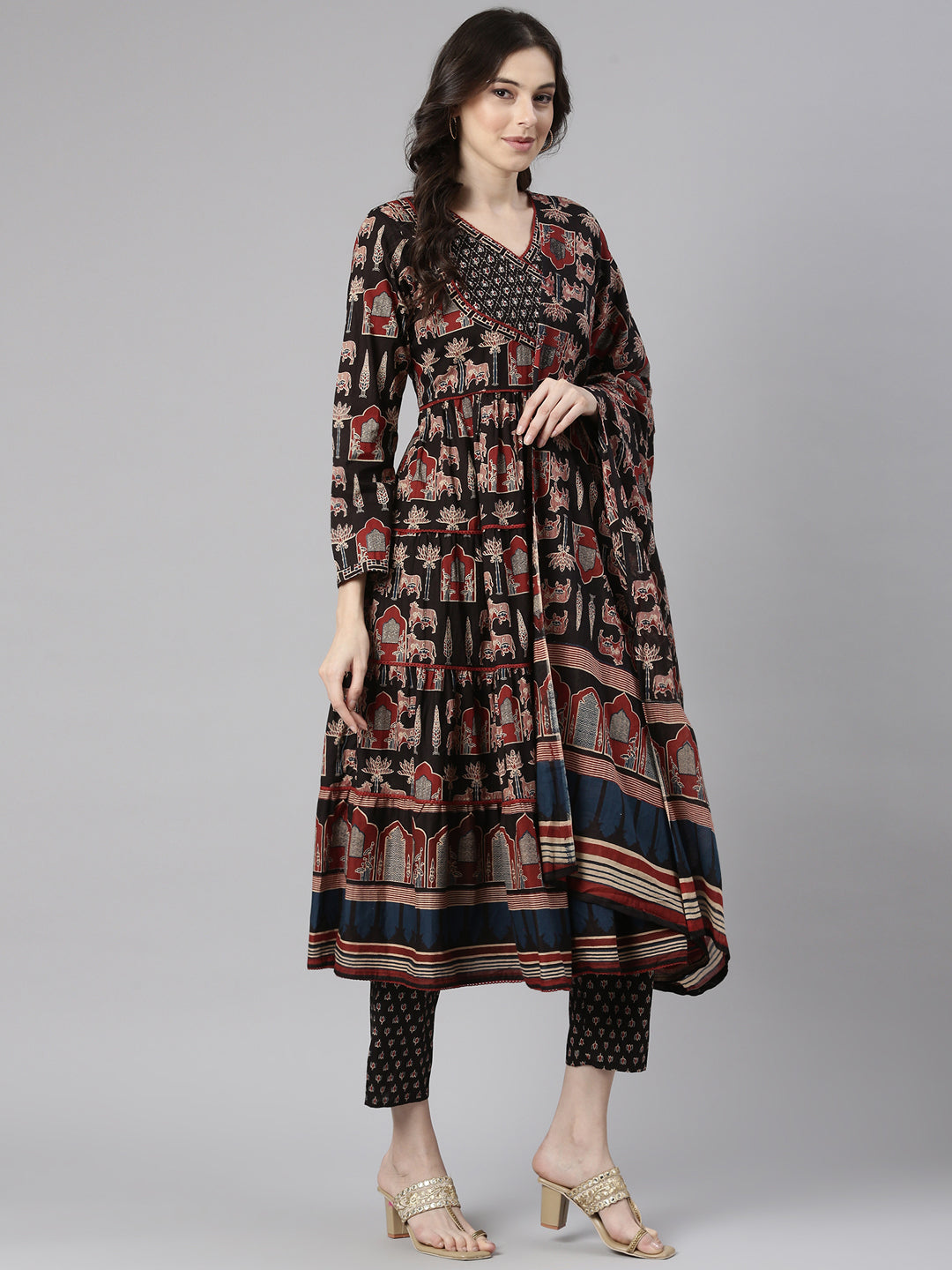 Neerus Black Printed Anarkali Kurta and Trousers With Dupatta