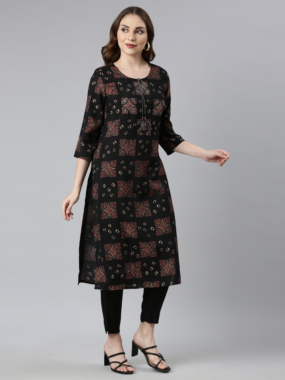 Neerus Black Regular Straight Geometric Kurta And Trousers With Dupatta