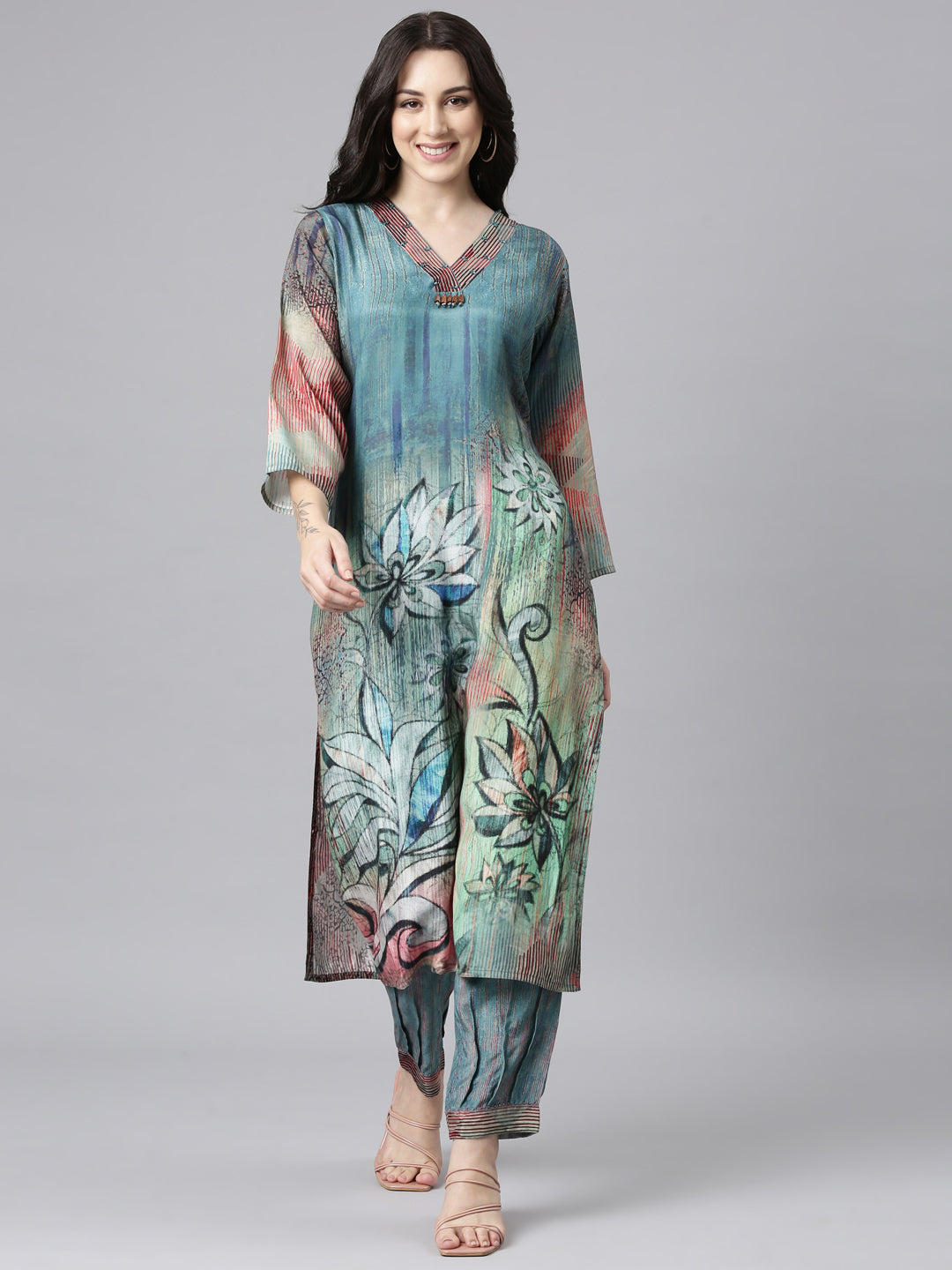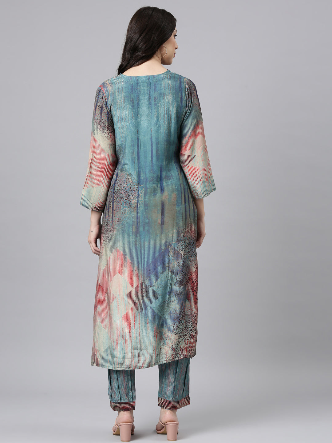 Neerus Blue Panelled Straight Kurta and Trousers A trendy and elegant set that will make you stand out at any event.