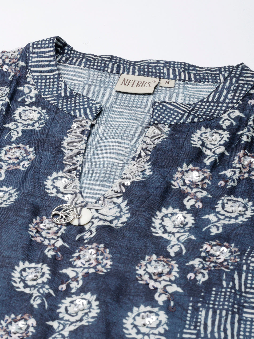 Neerus Blue Panelled Straight Kurta and Trousers With Dupatta Perfect for any occasion, this outfit features intricate detailing and stunning craftsmanship that will make you stand out from the crowd.