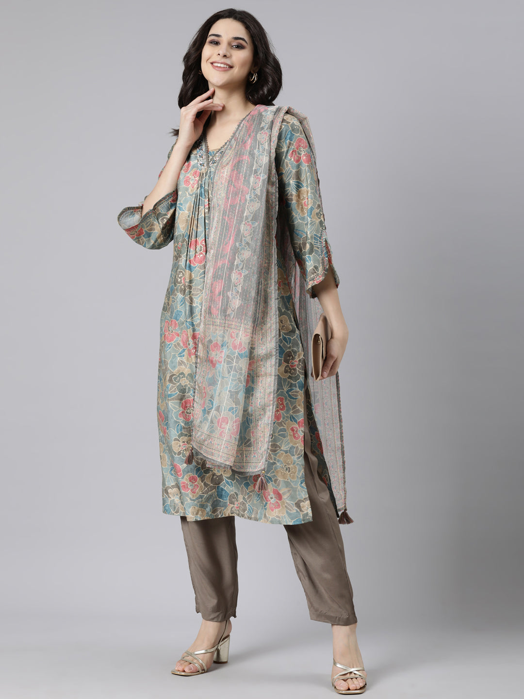 Indulge in the luxurious Neerus Blue Pleated Straight Floral Kurta And Trousers, complete with a stunning Dupatta.