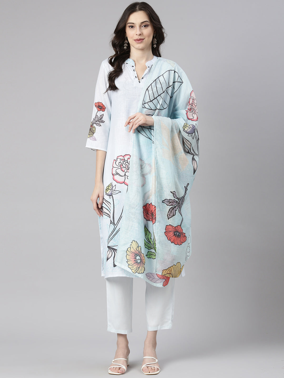 Neerus Blue Printed Straight Kurta and Trousers With Dupatta
