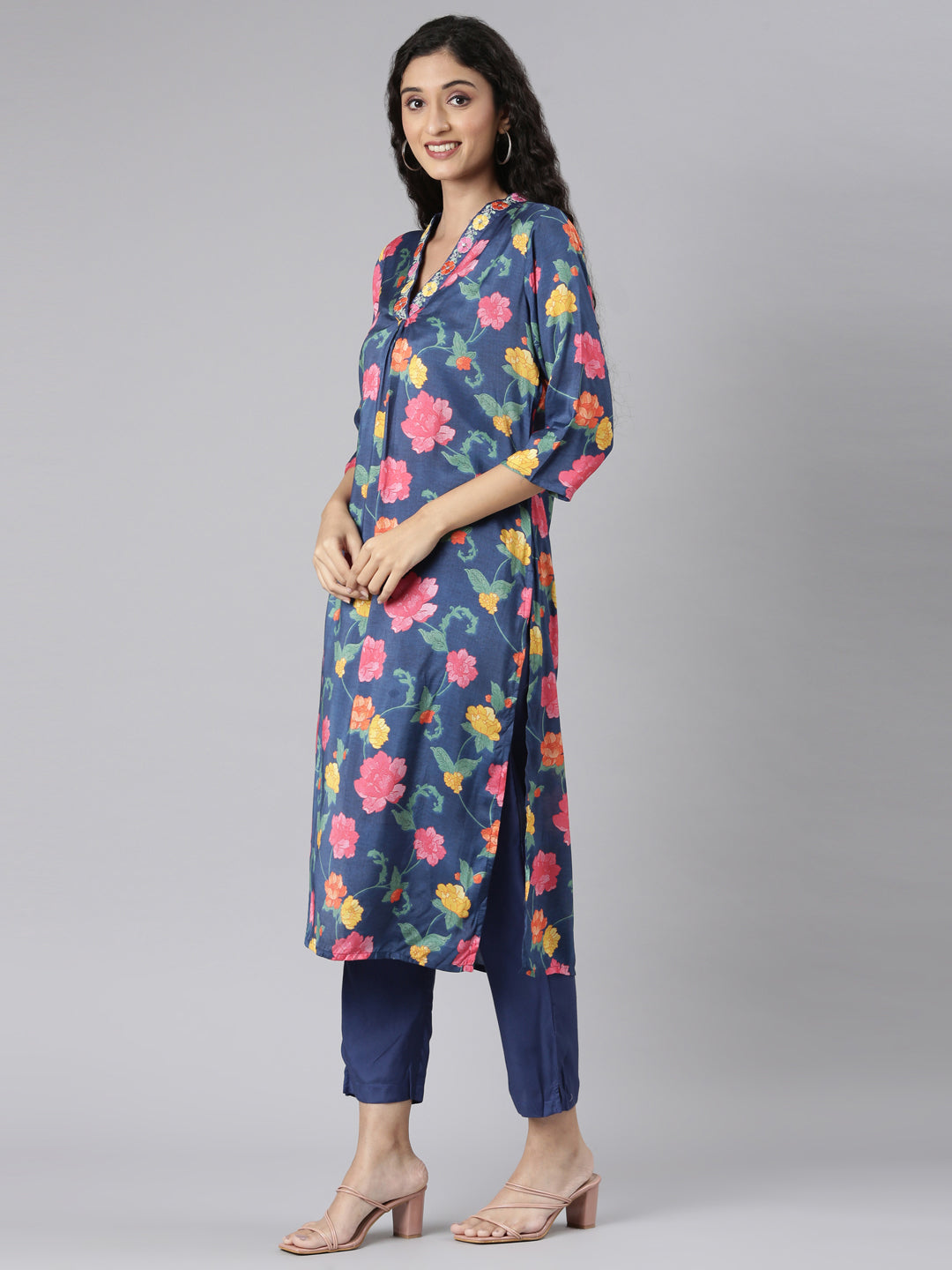 Neerus Blue Straight Casual Floral Kurta Sets Comfy and stylish, this kurta set is perfect for casual occasions.