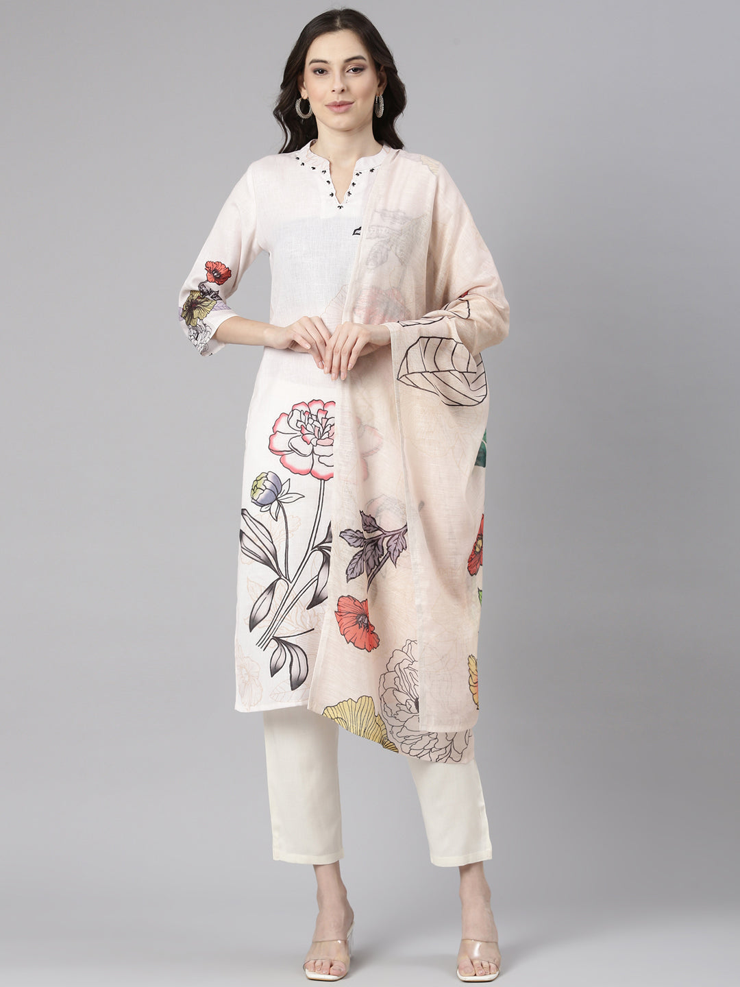Neerus Cream Printed Straight Kurta and Trousers With Dupatta