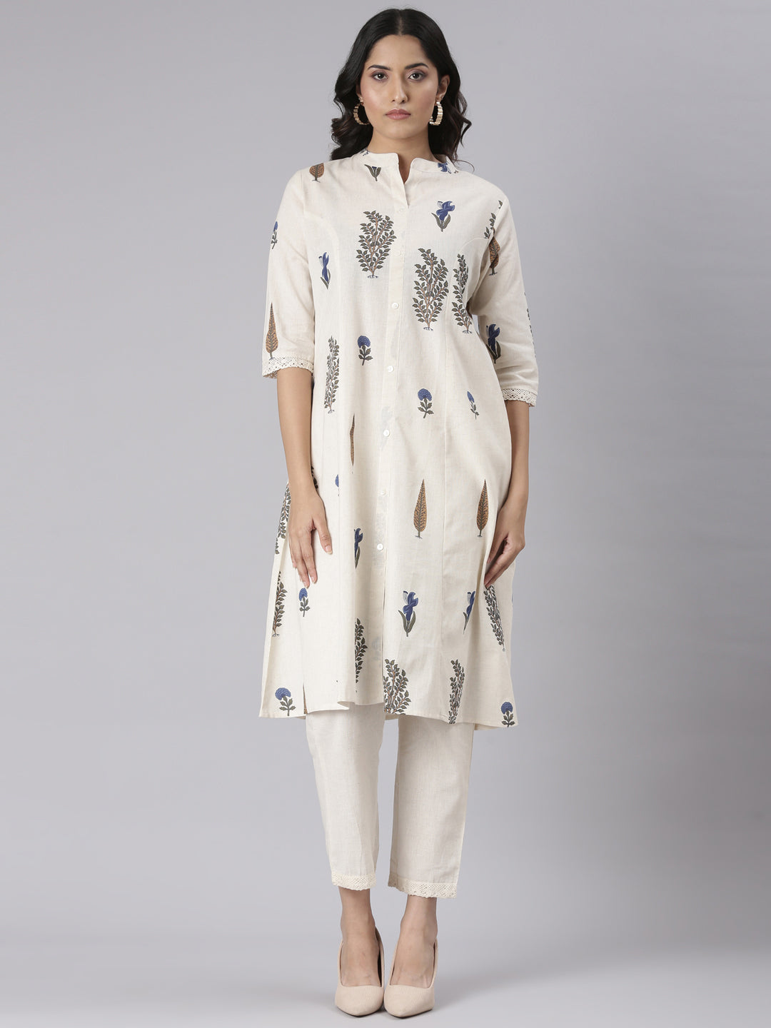 The Neerus Cream Solid Straight Kurta and Trousers set embodies refined elegance with its clean lines and understated cream hue. Designed for a sleek silhouette, the straight kurta pairs effortlessly with matching trousers, offering a sophisticated look ideal for formal events and celebrations.