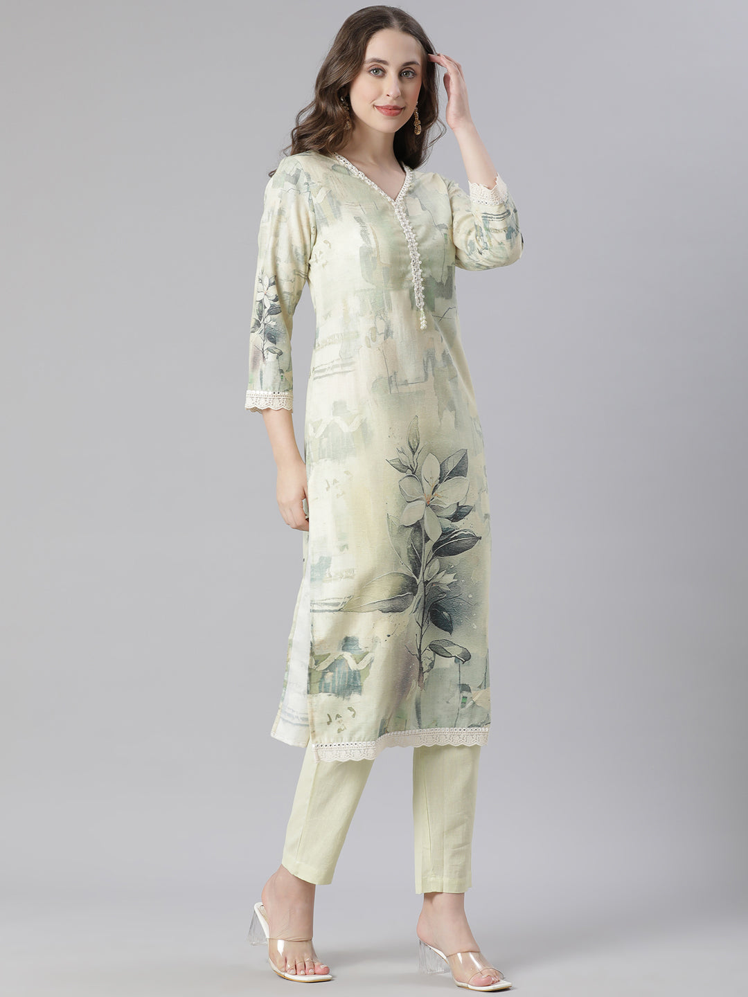 Neerus Green Printed Straight Kurta and Trousers With Dupatta