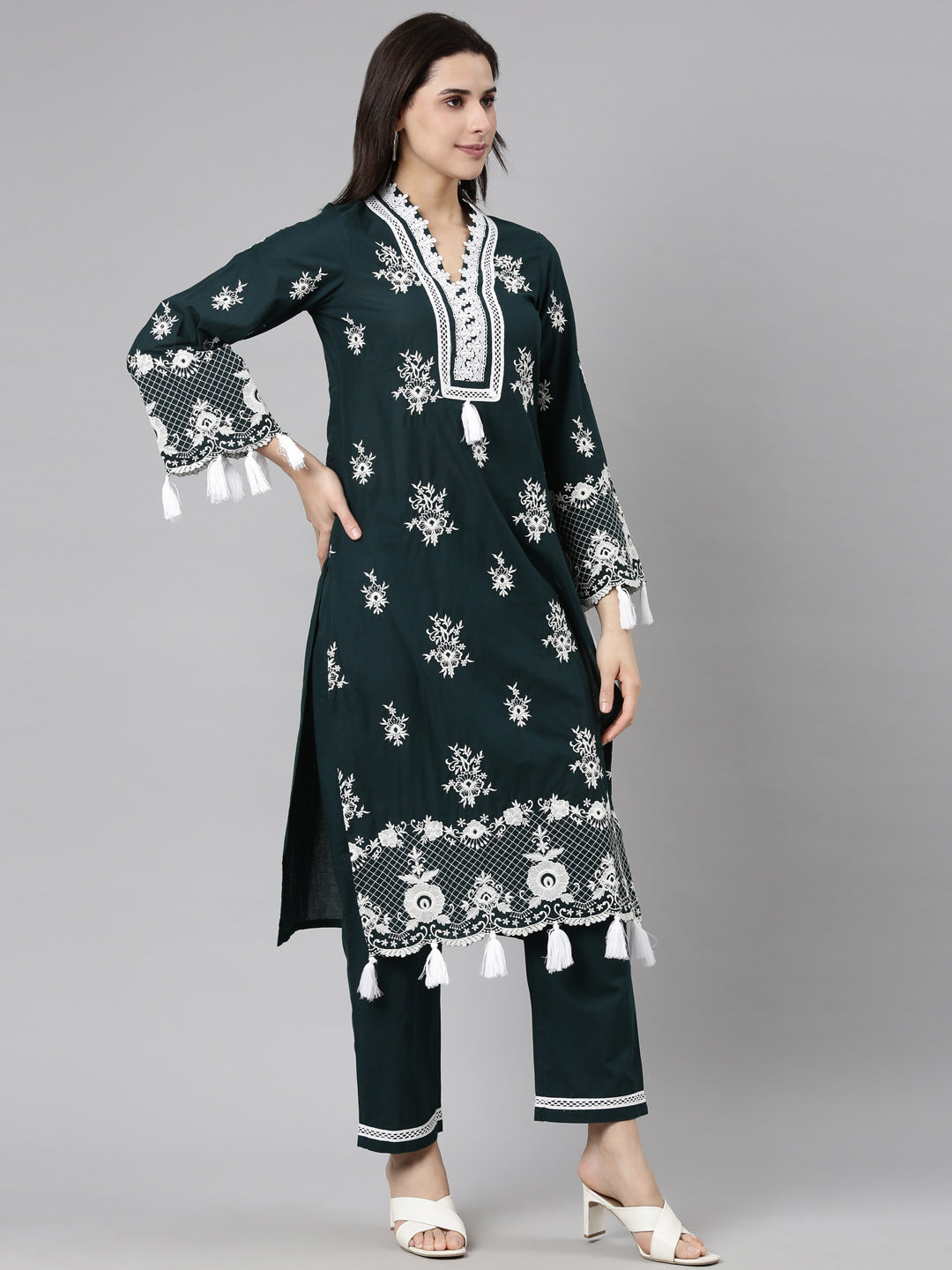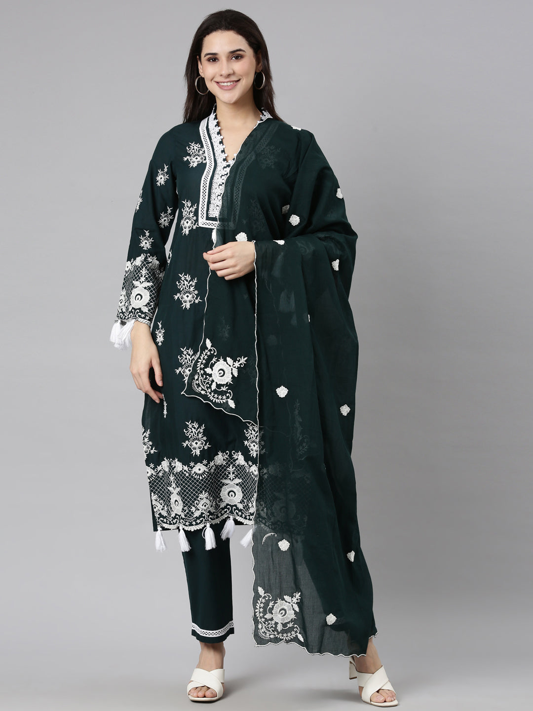 Neerus Green Regular Straight Floral Kurta And Trousers With Dupatta