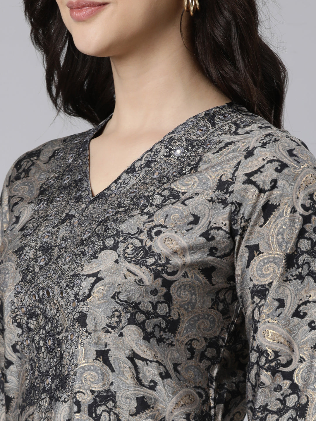 Neerus Grey Regular Straight Paisley Kurta And Trousers With Dupatta