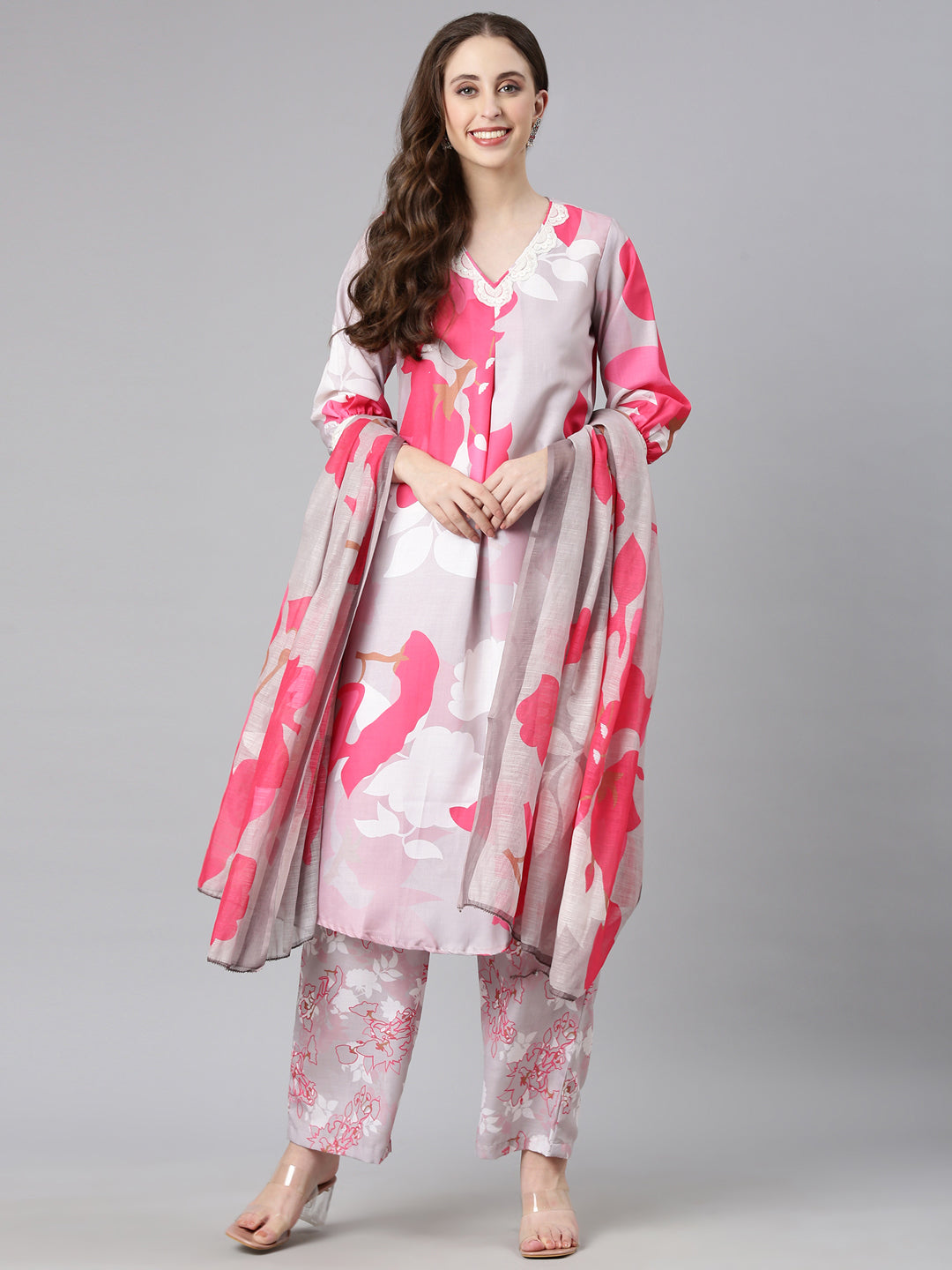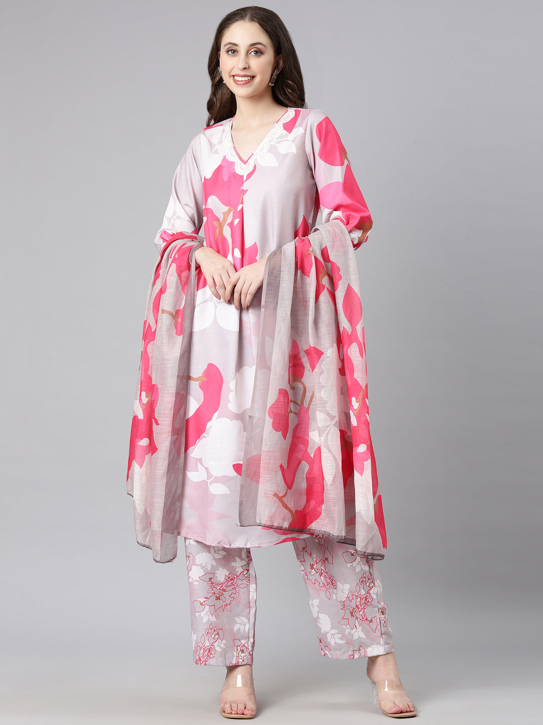Neerus L gray Printed Straight Kurta and Trousers With Dupatta