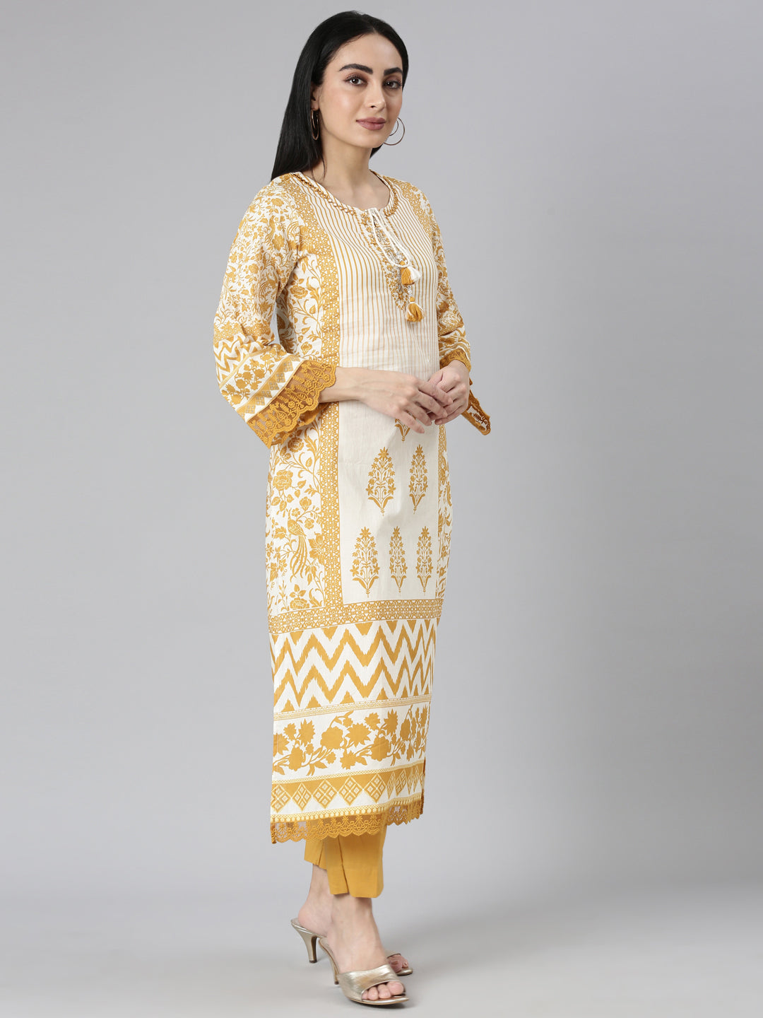 Neerus Mustard Regular Straight Printed Kurta and Trousers With Dupatta Elevate your ethnic attire with this striking kurta and trousers set. Includes a vibrant dupatta that adds a touch of elegance.