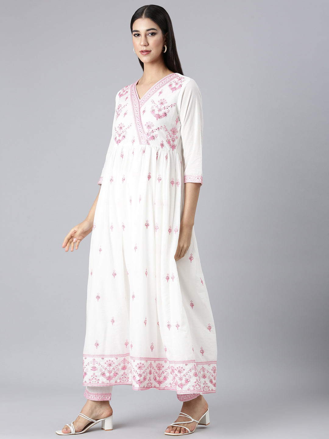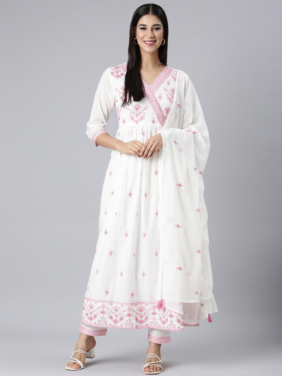 Elevate your ethnic wardrobe with this meticulously crafted three-piece ensemble featuring a pink embroidered kurta with elegant curved hemline, complementary trousers, and matching dupatta.