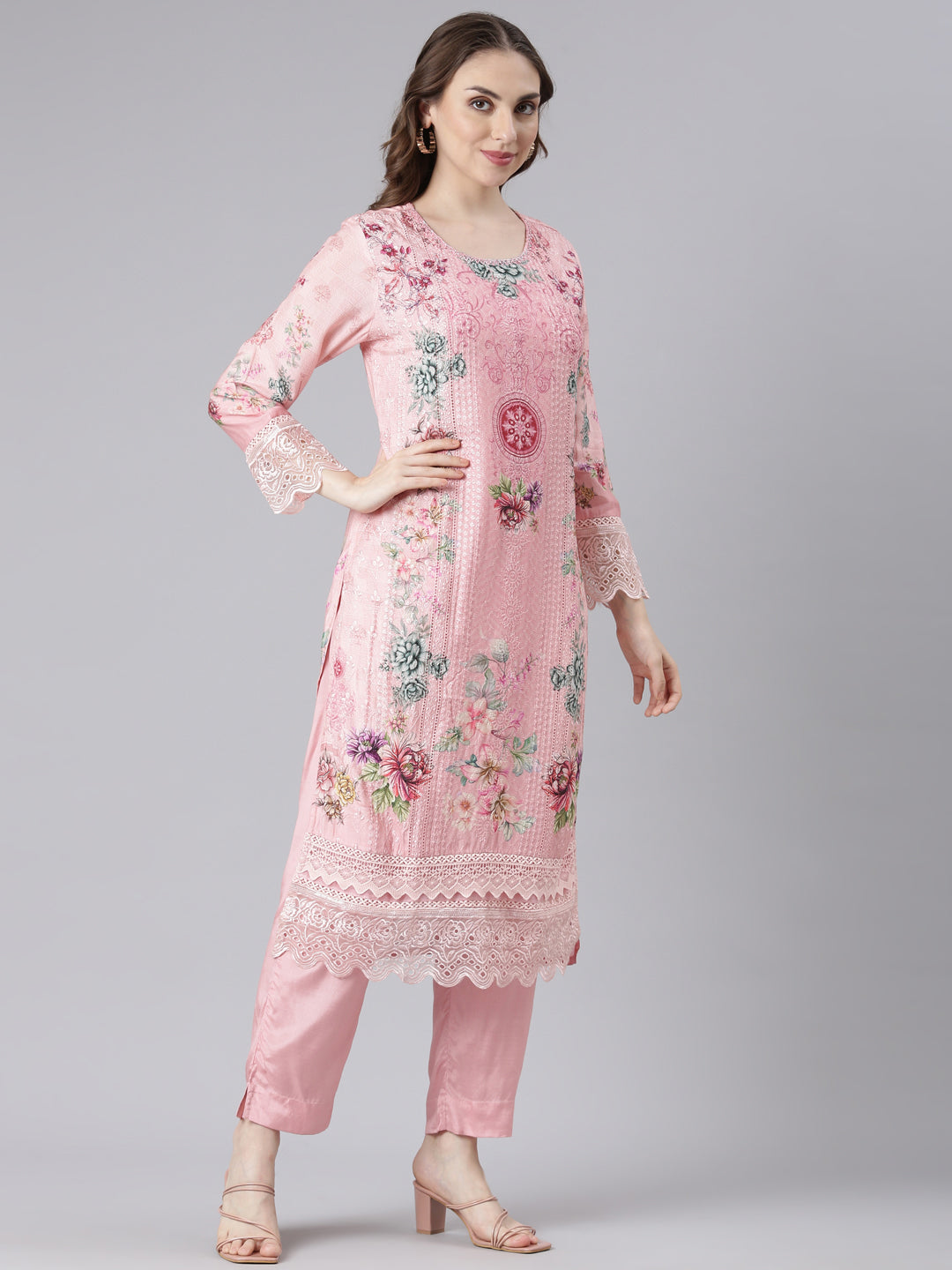 Neerus Pink Muslin Straight Casual Floral Kurta and Trouser with Dupatta