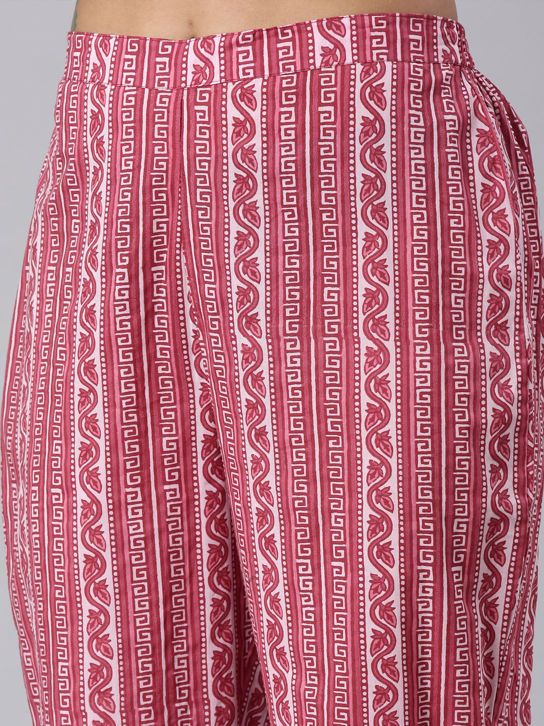 This pink printed kurta, trousers, and dupatta set from Neerus offers effortless elegance and comfort. The straight-cut design and soft fabric provide a flattering fit and feel. With its intricate print and panel detailing, this set is perfect for any occasion.