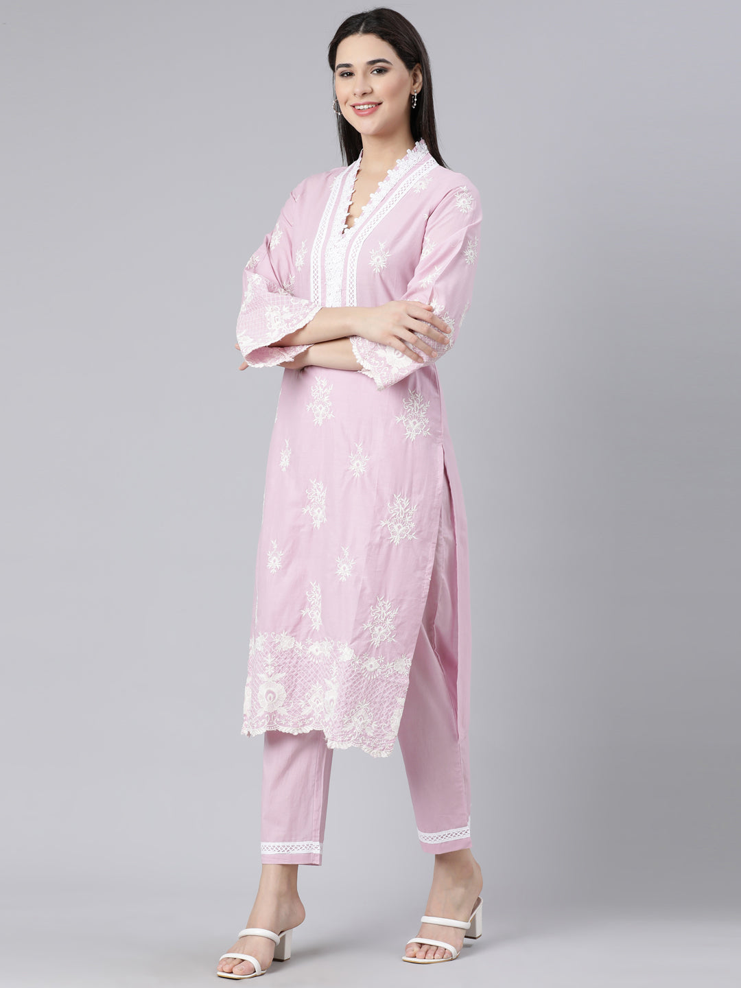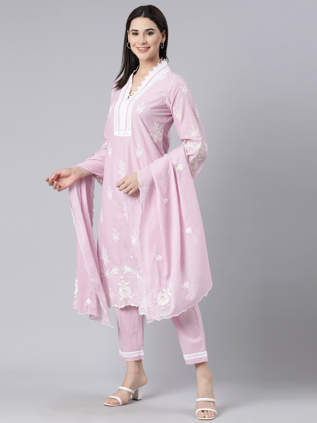 Neerus Pink Panelled Straight Yoke Design Kurta And Trousers With Dupatta