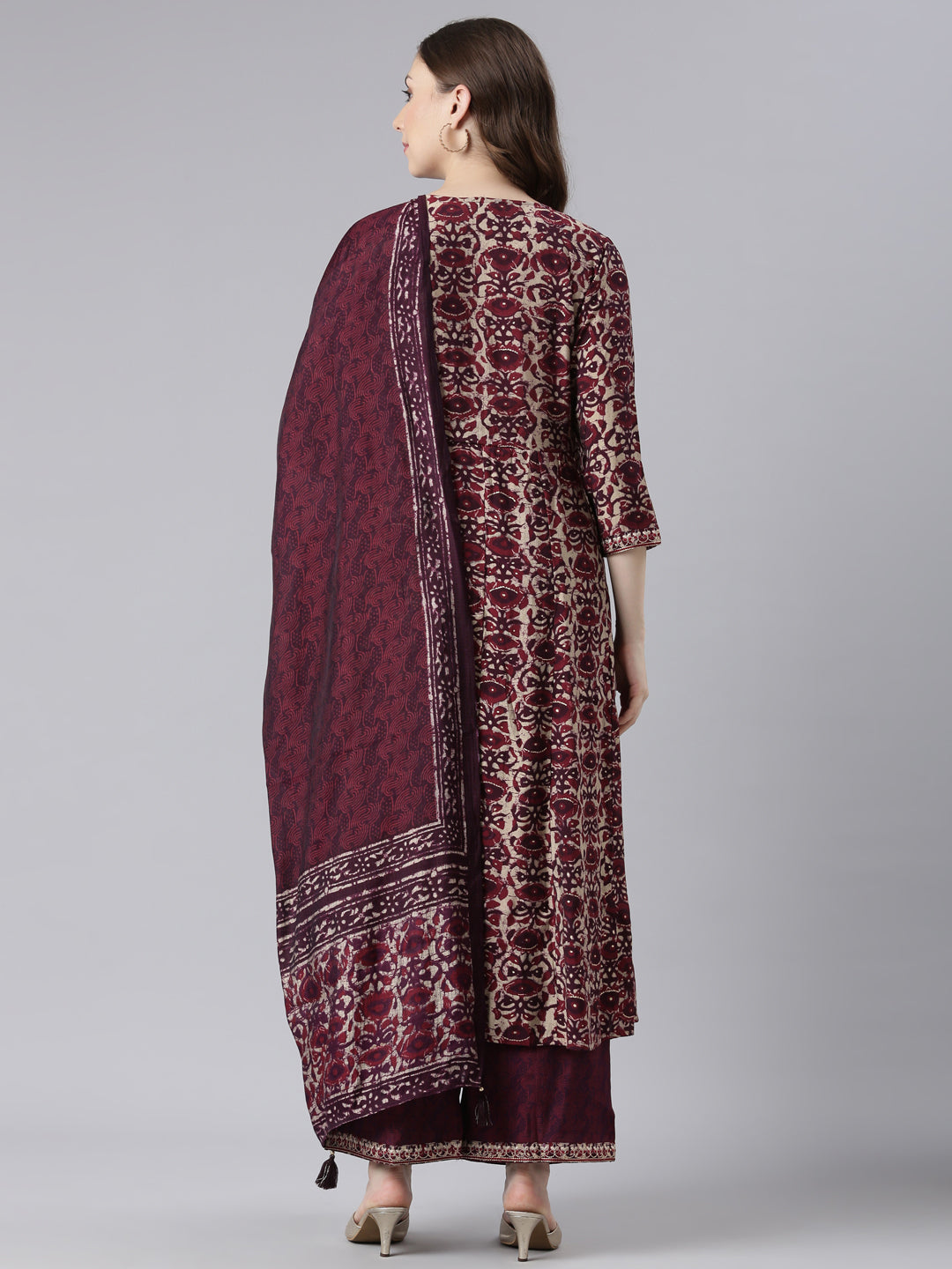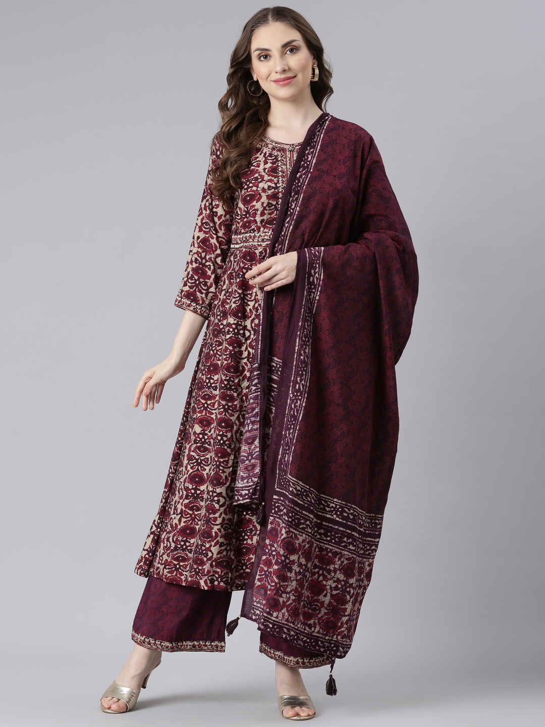 Neerus Purple Model Curved Casual Floral Kurta and Trouser with Dupatta
