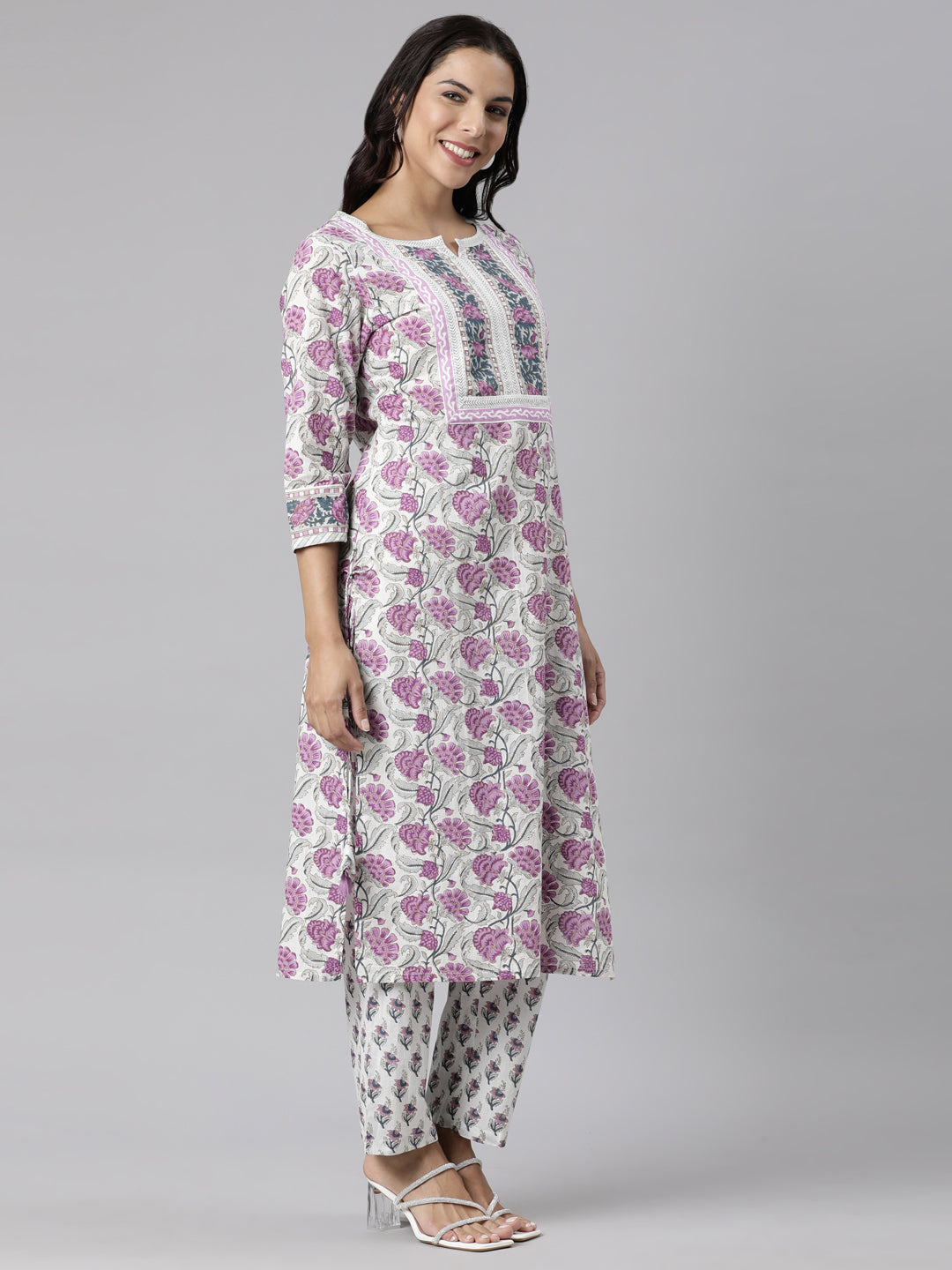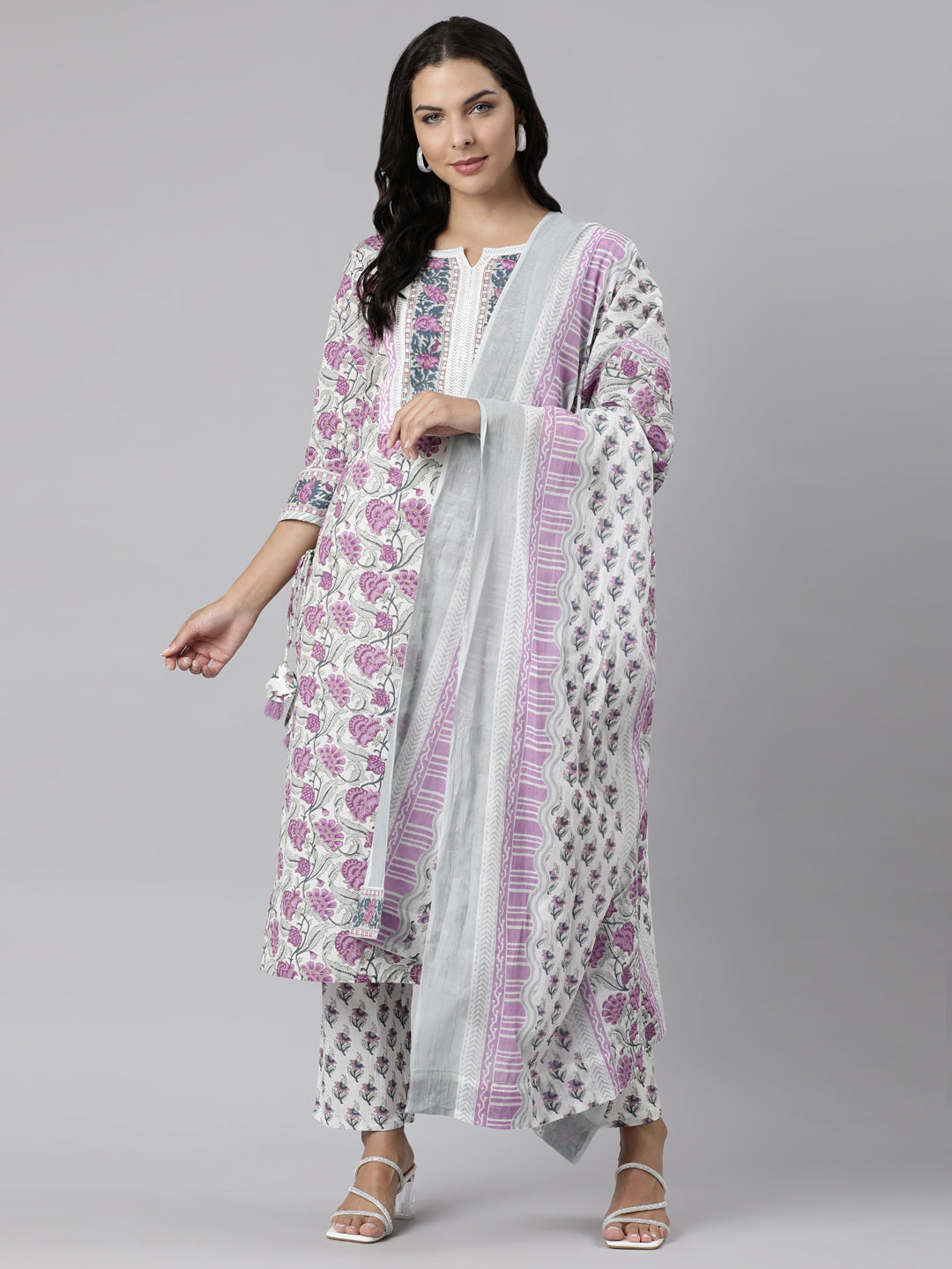 Update your wardrobe with the Neerus Purple Panelled Straight Printed Kurta And Trousers With Dupatta. This elegant set features a beautiful printed design and comes with a matching dupatta, perfect for any occasion.