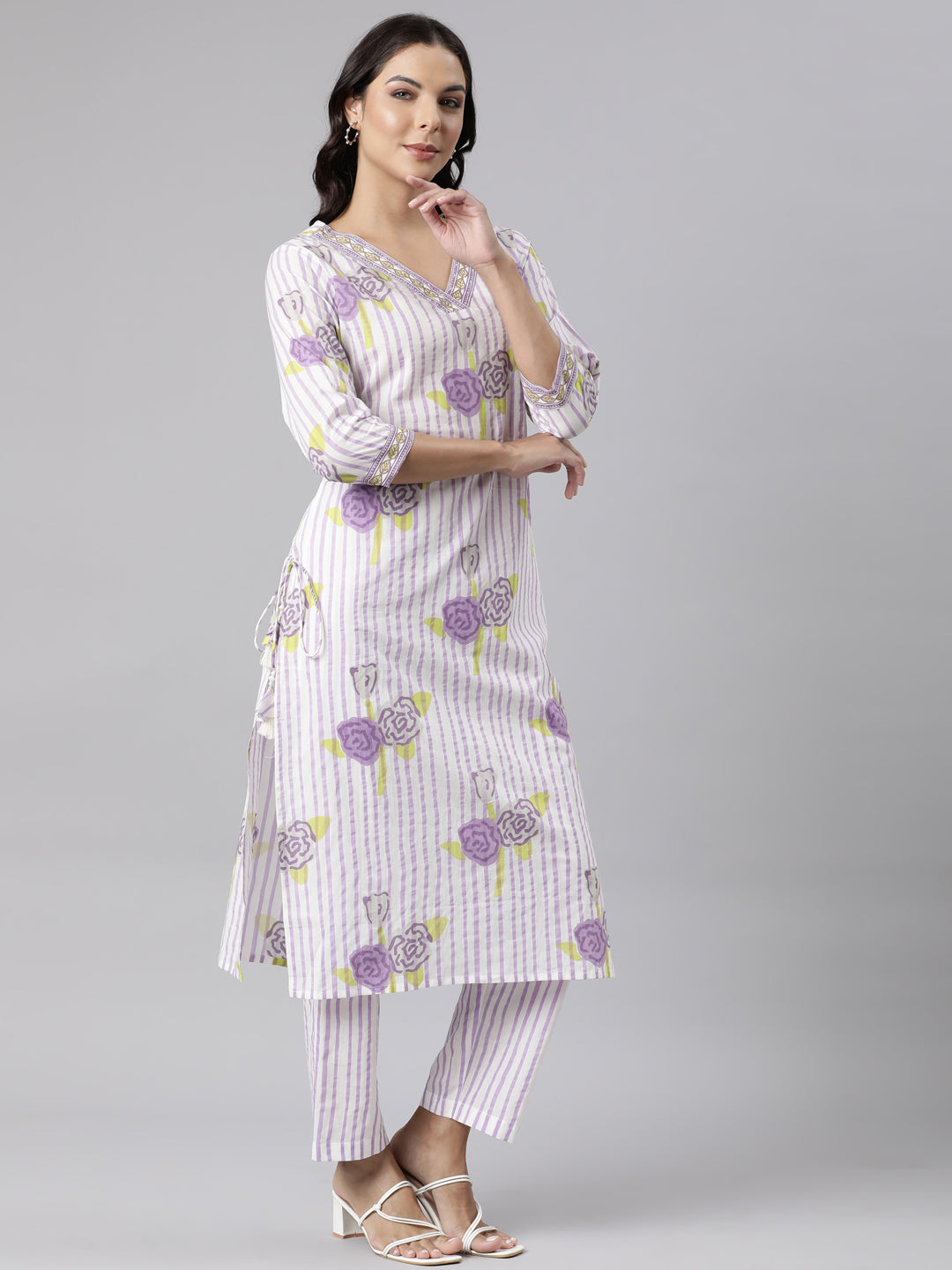 This Neerus Purple Kurta set features a straight printed kurta, trousers, and a matching dupatta. The panelled design adds a touch of elegance to this outfit. Perfect for a stylish and comfortable ethnic look.
