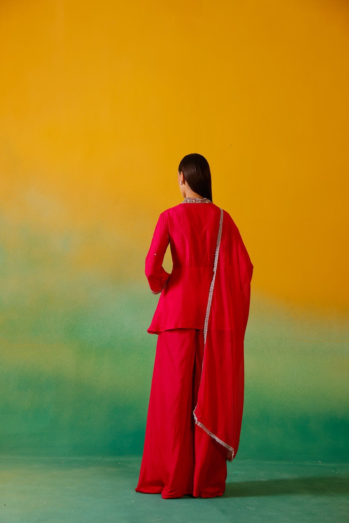 Neerus Rani Pink Embroidery Silk fabric Kurti and plazzo with Dupatta. It's a beautiful and versatile outfit for any occasion, adding an elegant touch to your wardrobe.