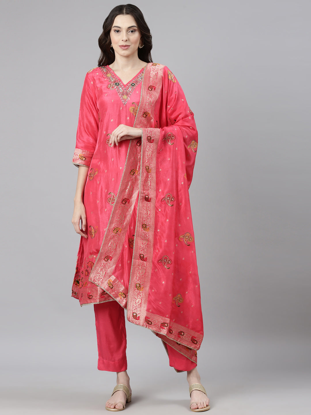 Neerus Red Casual Paisley Straight Kurta and Trousers With Dupatta