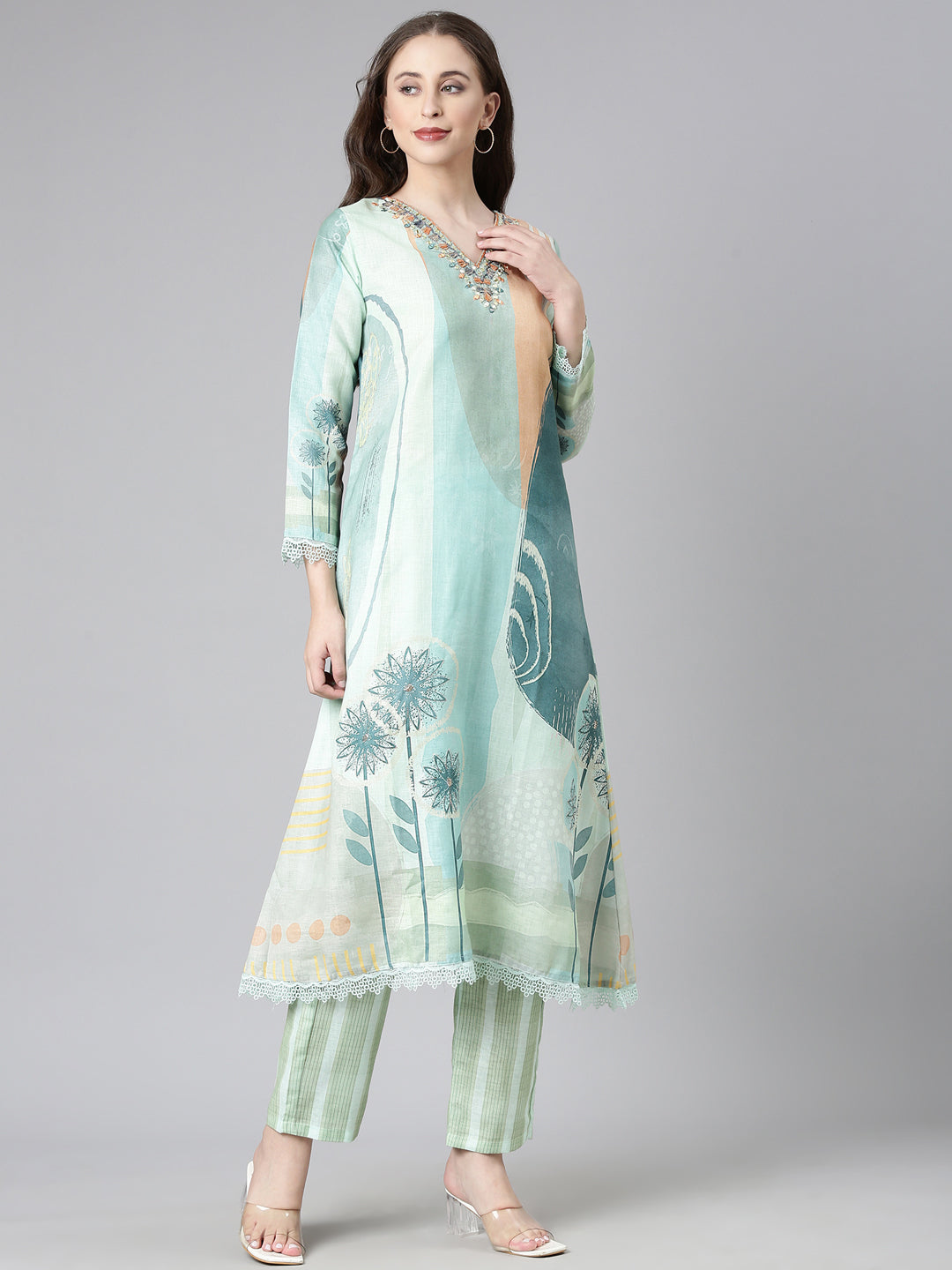 Elevate your ethnic wardrobe with the Neerus Sea Green Solid Straight Kurta and Trousers set, complemented by a matching dupatta. Crafted for a refined silhouette, the straight kurta offers a sleek, tailored fit that enhances your posture. The coordinating trousers ensure comfort and style, while the dupatta adds a graceful finishing touch.