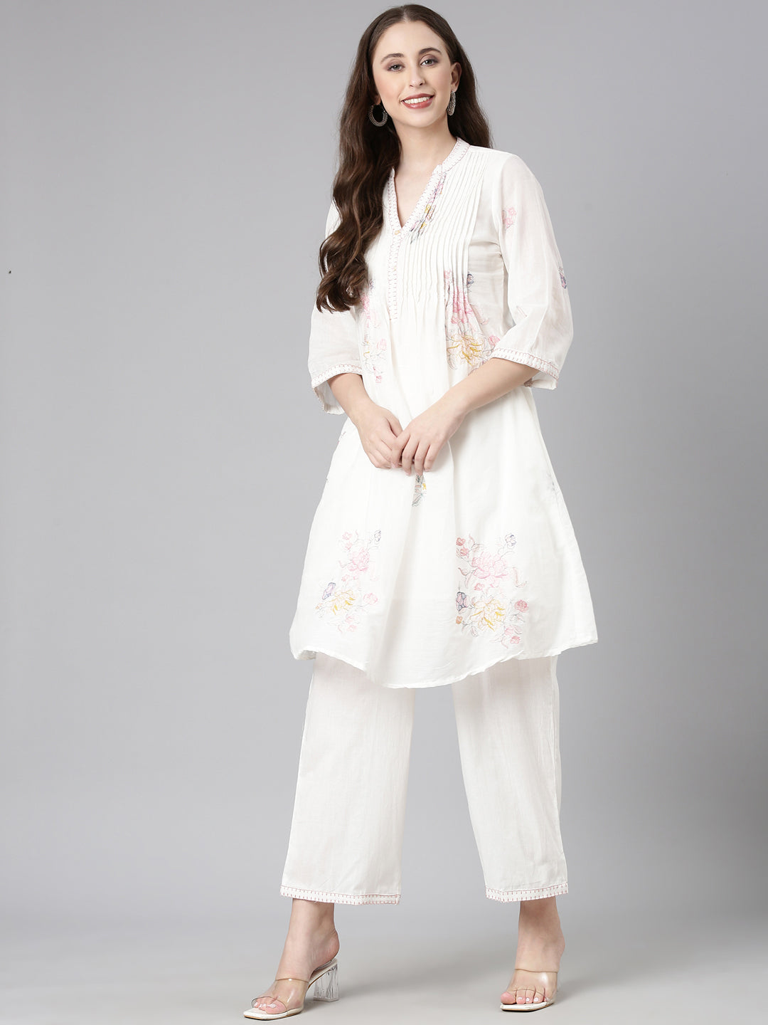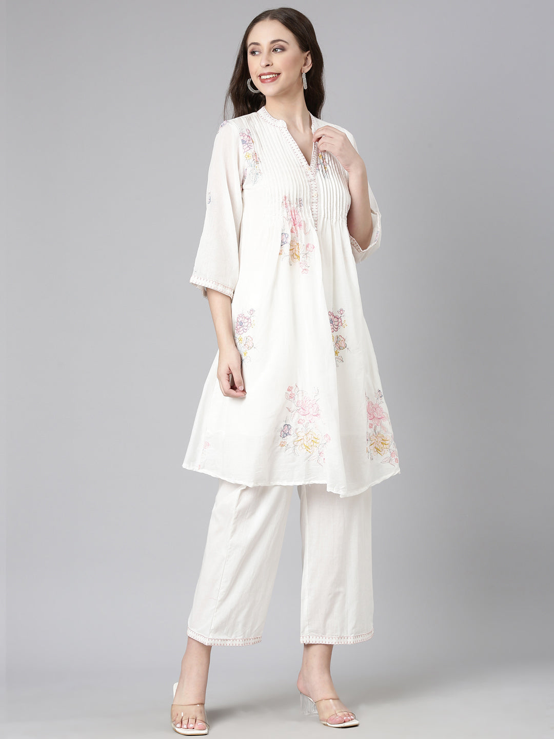 Elevate your ethnic wardrobe with the Neerus White Printed A-Line Kurta and Trousers set. Crafted for a flattering silhouette, the A-line kurta features delicate prints that add subtle elegance. Paired with matching trousers, this ensemble offers both comfort and style, ideal for formal occasions or festive gatherings.