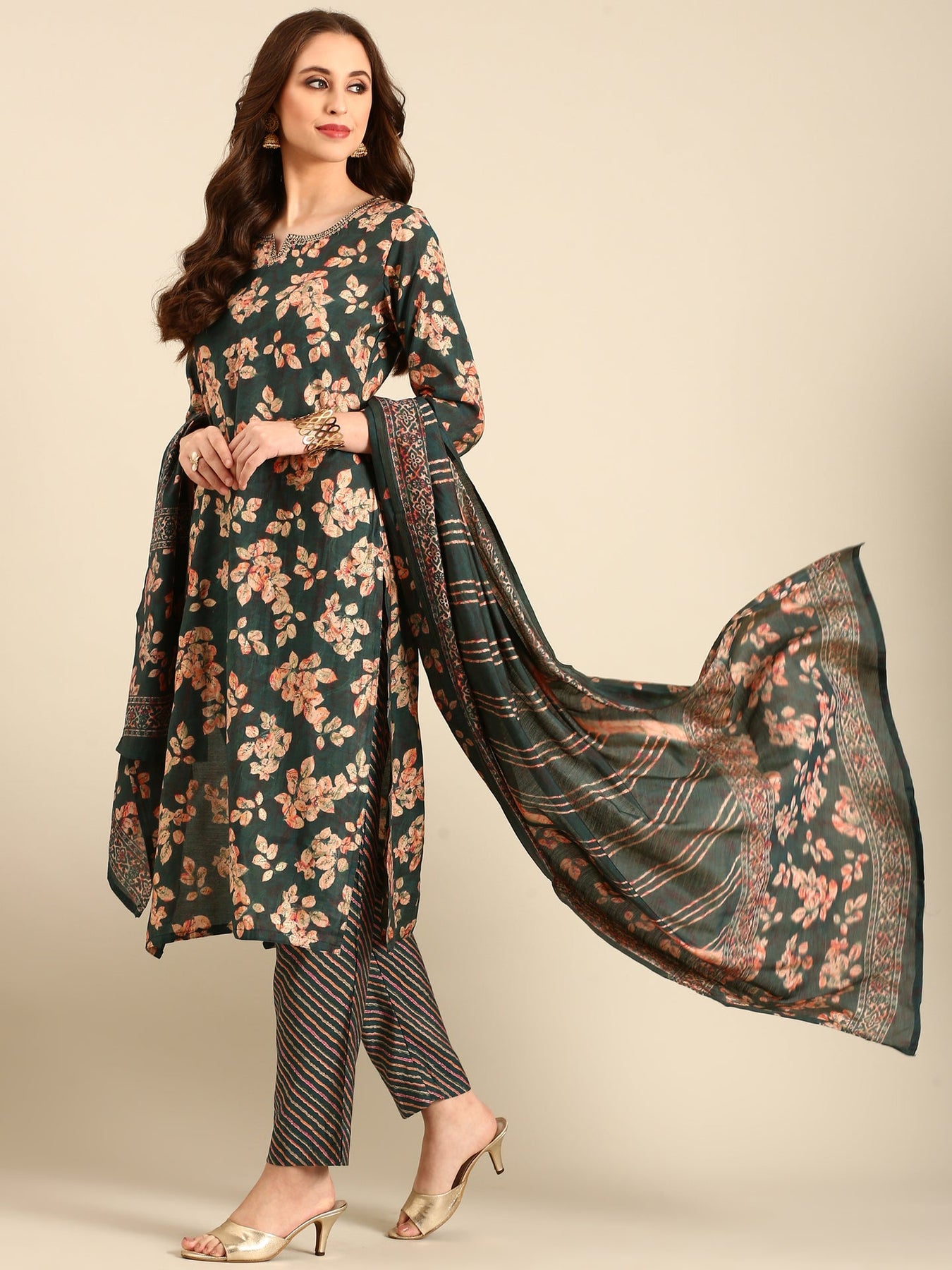 Experience elegance with the Peacock Green Printed Suit Set, featuring luxurious modal silk adorned with an all-over peacock print. The foil neck zari embroidery adds a touch of shimmer, enhancing its regal appeal. Complete with a matching dupatta, this set effortlessly combines comfort and style, perfect for special occasions or festive celebrations. Embrace tradition with a contemporary flair in this stunning ensemble.