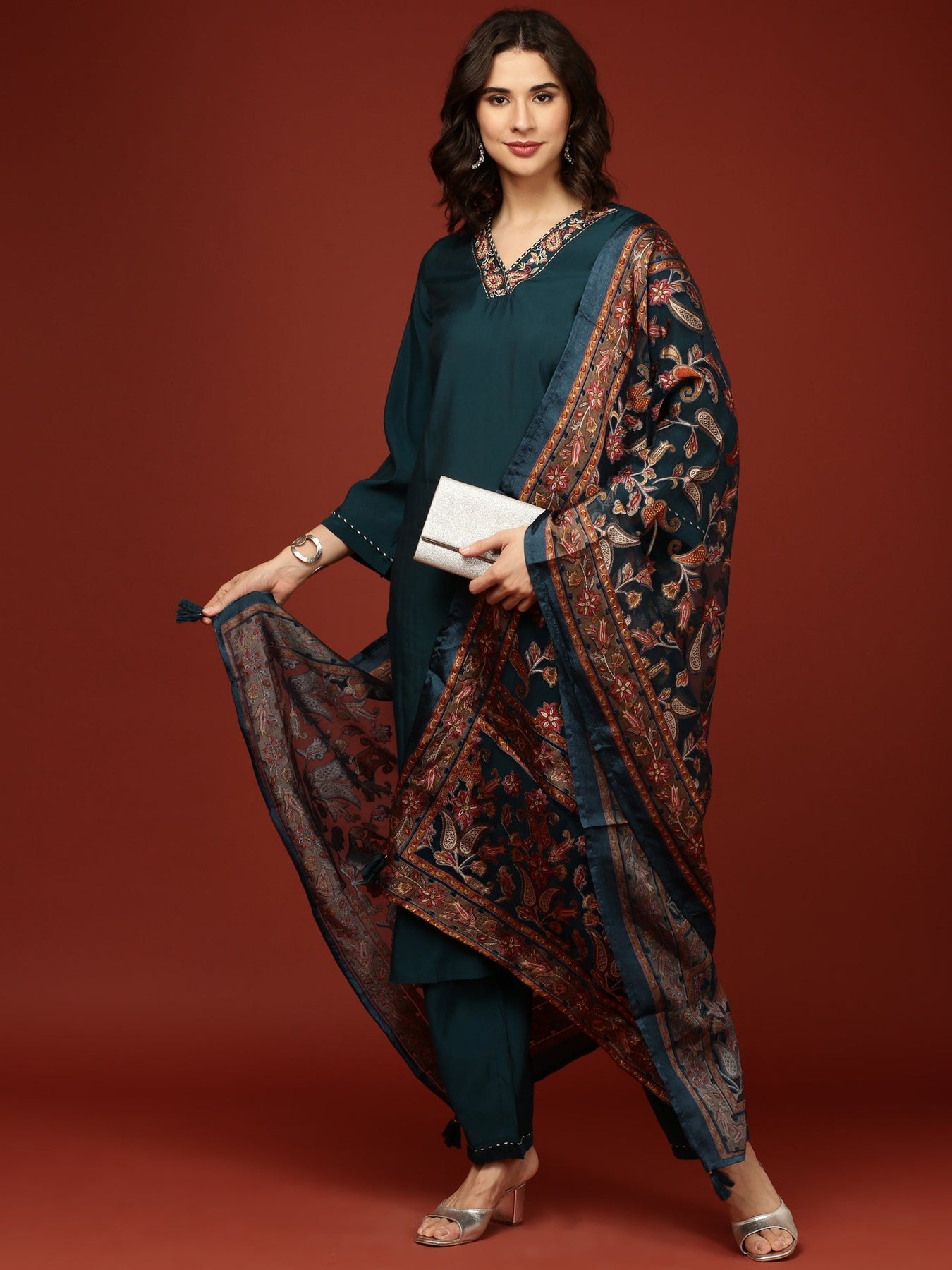 Elevate your wardrobe with the Peacock Modal Silk Three Piece Suit Set, crafted for refined elegance and comfort. This luxurious ensemble combines the smooth, breathable feel of modal silk with a timeless design, offering a perfect blend of style and sophistication. Ideal for formal occasions or upscale gatherings, the set ensures you stand out with subtle grace and impeccable tailoring.