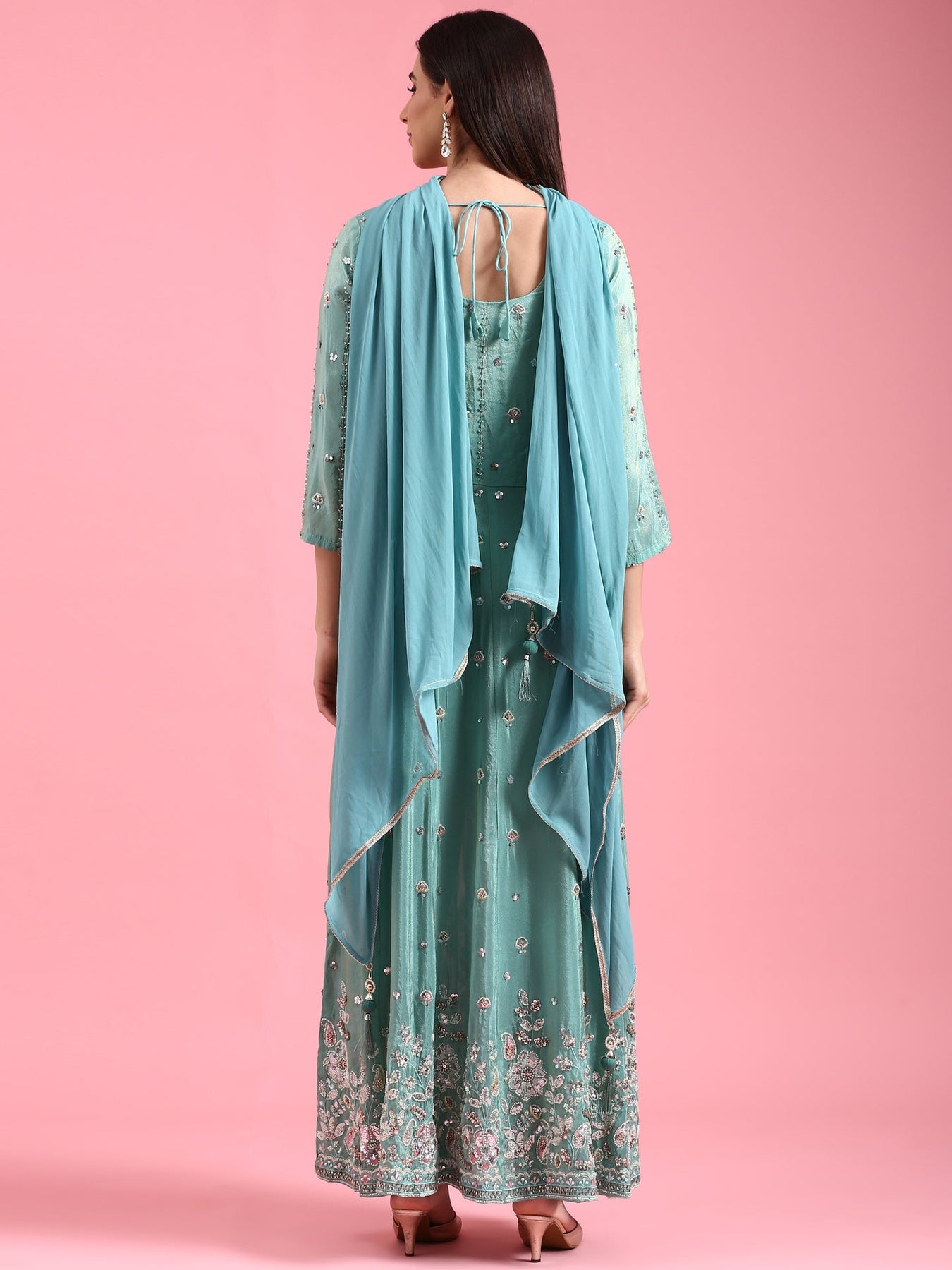 Elevate your wardrobe with this elegant Sea Green Tissue beads work kali paired with a matching palazzo. The delicate beadwork adds a refined texture, while the flowing palazzo ensures comfort and grace. Perfect for sophisticated occasions, this ensemble blends traditional craftsmanship with contemporary style for a poised and polished look.