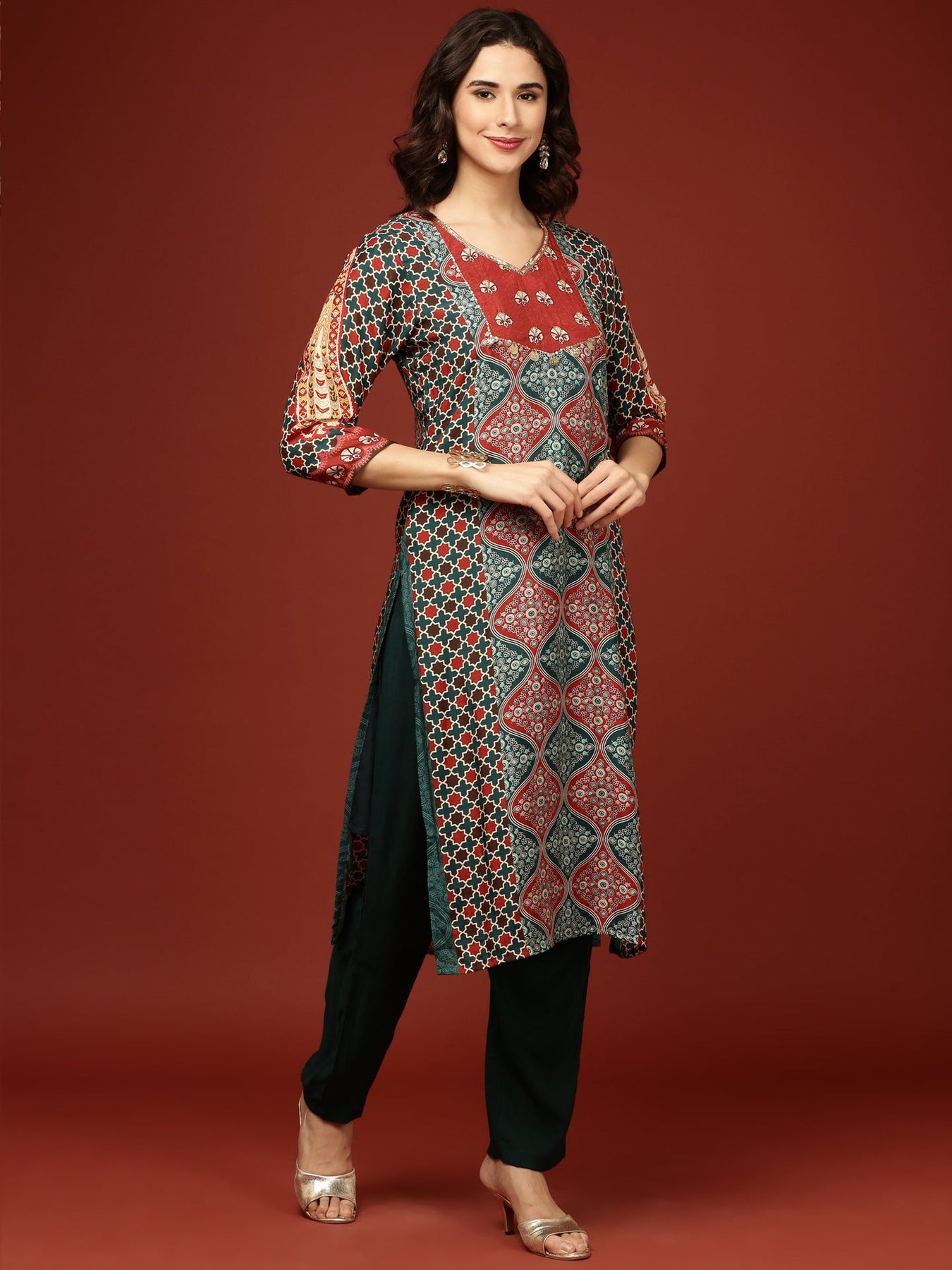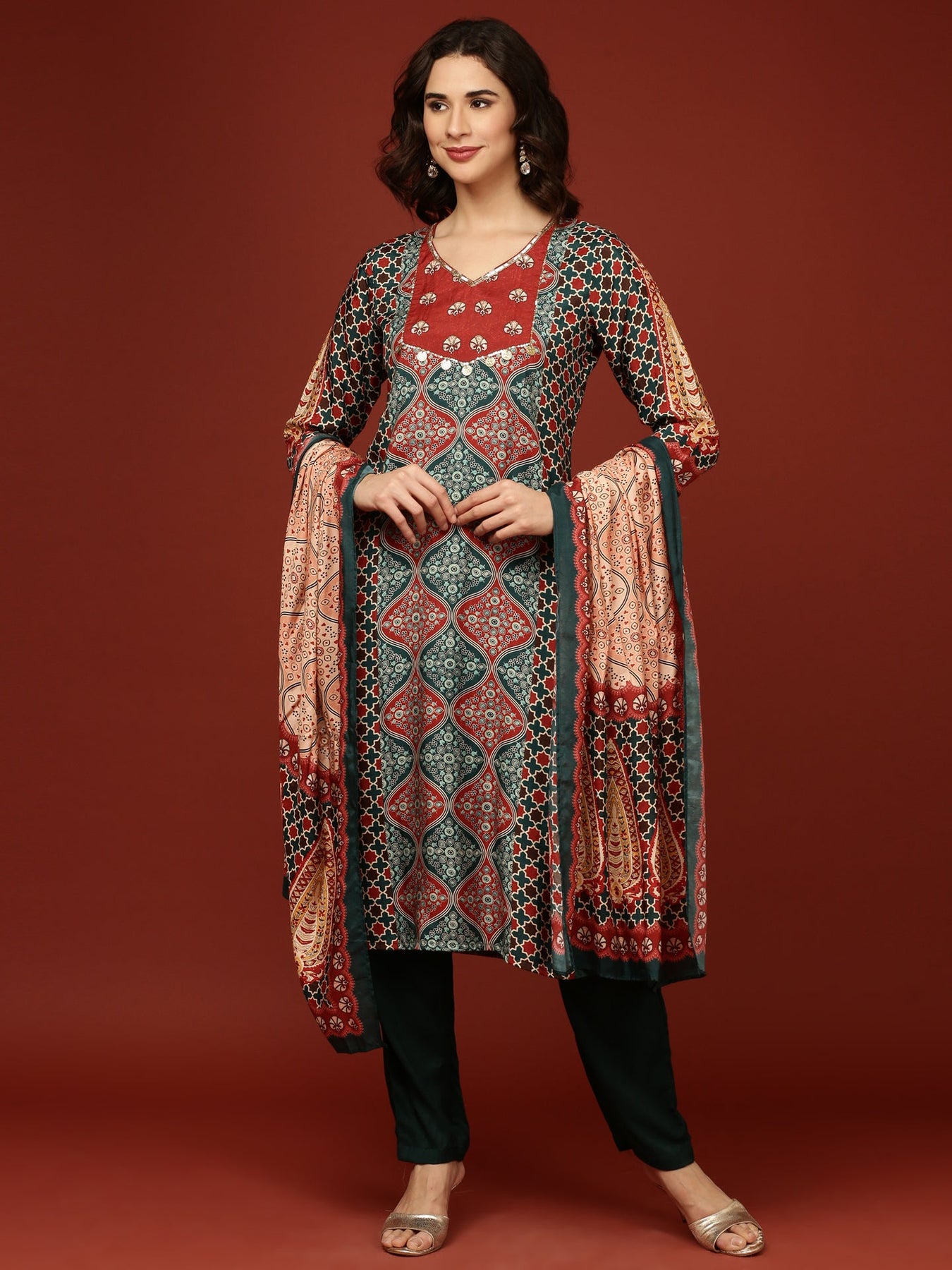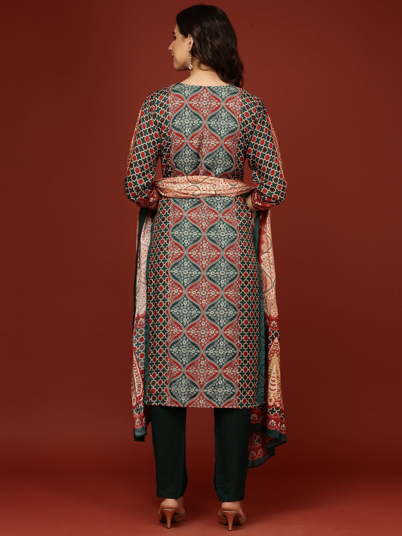 This Teal Blue Crepe Printed Three Piece Set offers an elegant blend of comfort and style. Crafted from soft crepe fabric, it features intricate prints that add a refined touch. The coordinated pieces provide versatility, allowing you to create polished looks effortlessly for both formal and casual occasions. Ideal for those who appreciate timeless sophistication in their wardrobe.