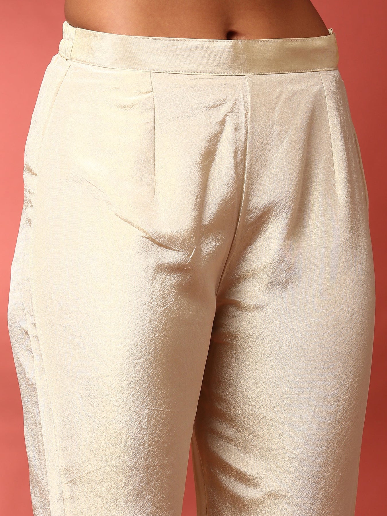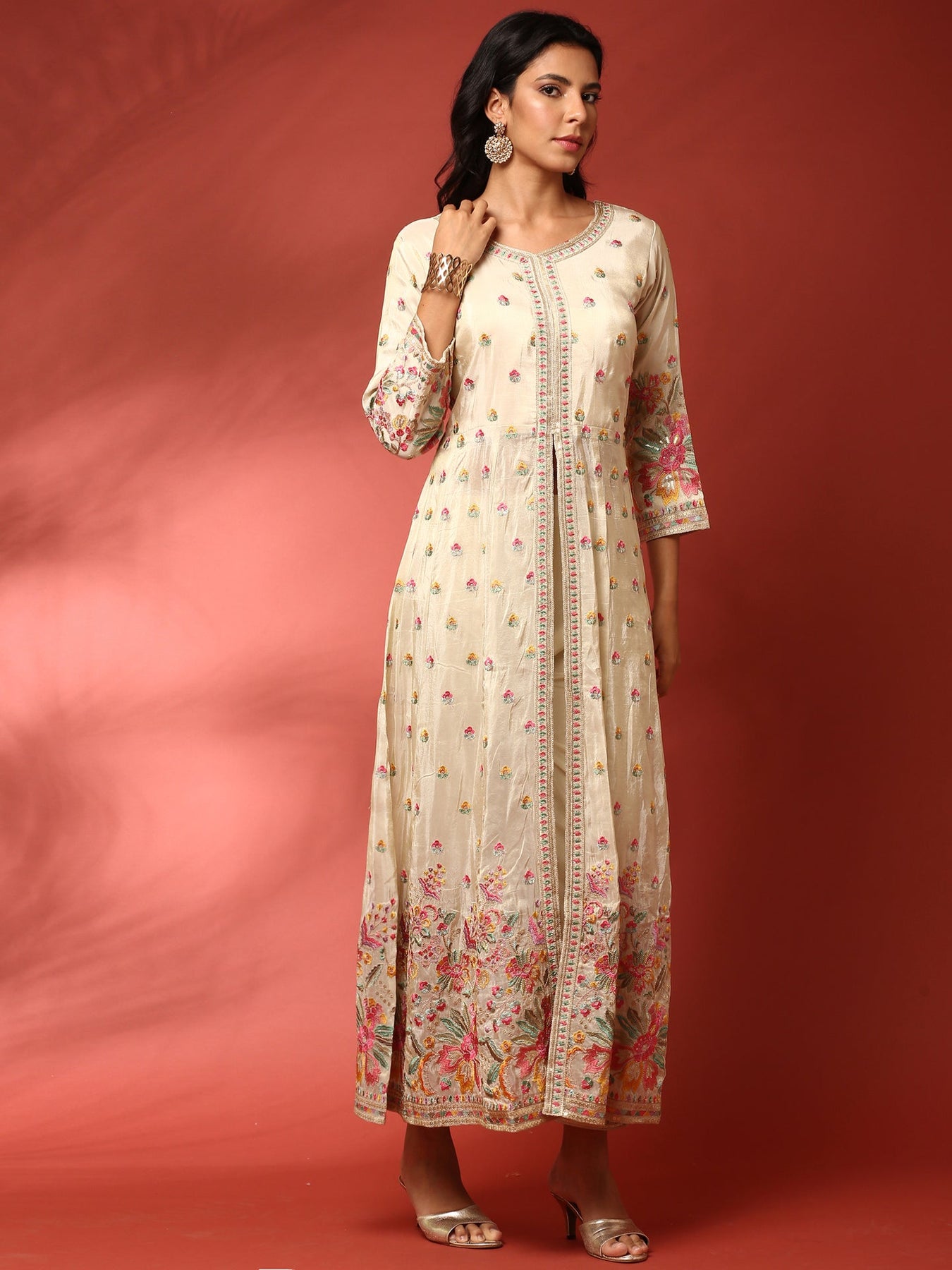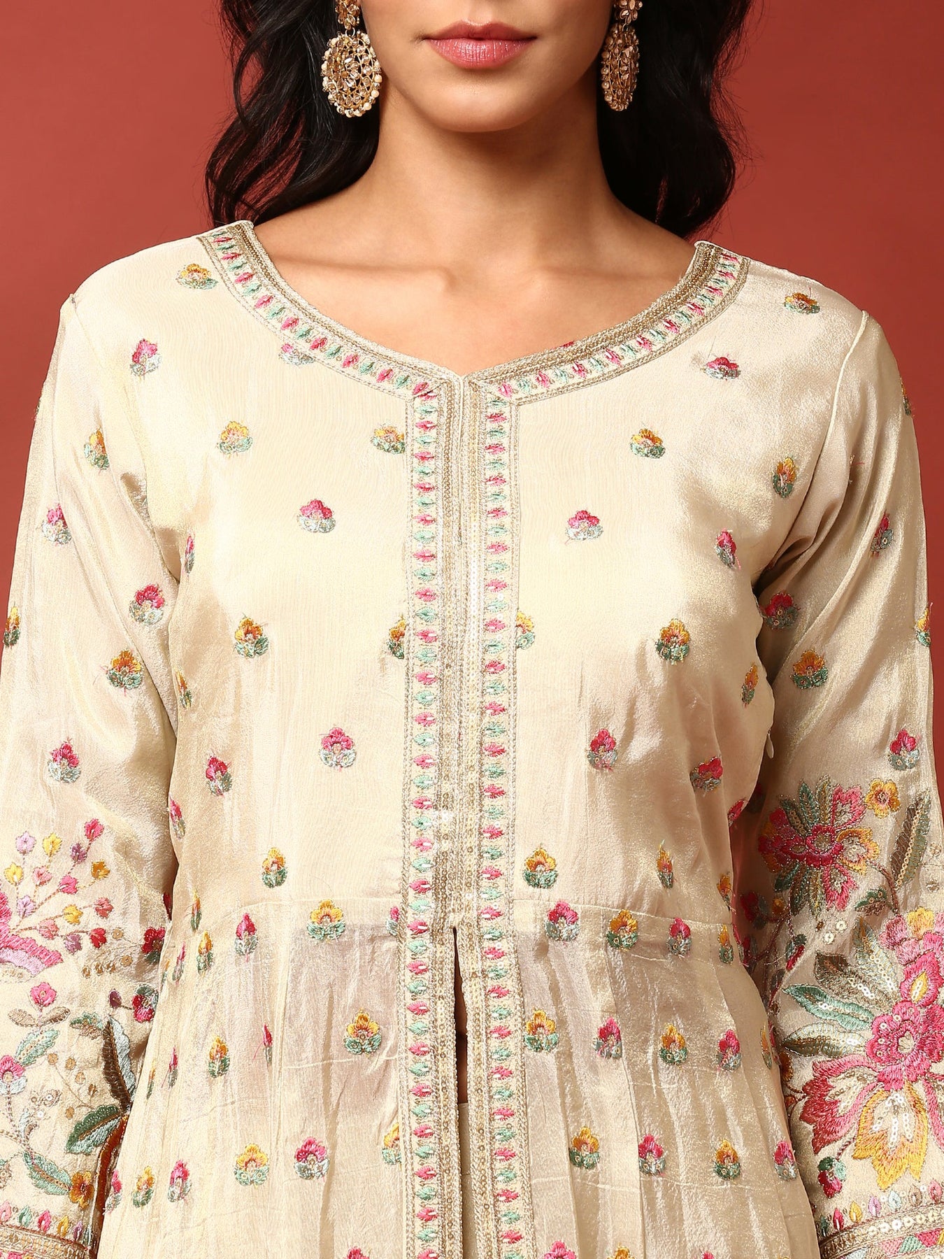 Elevate your ethnic wardrobe with this cream three-piece Anarkali set, crafted in delicate tissue fabric. Adorned with intricate floral thread work, it brings a refined elegance to any occasion. The lightweight fabric ensures comfort while the detailed embroidery adds a timeless charm, making it perfect for festive gatherings and special events. Embrace grace and style effortlessly with this exquisite ensemble.