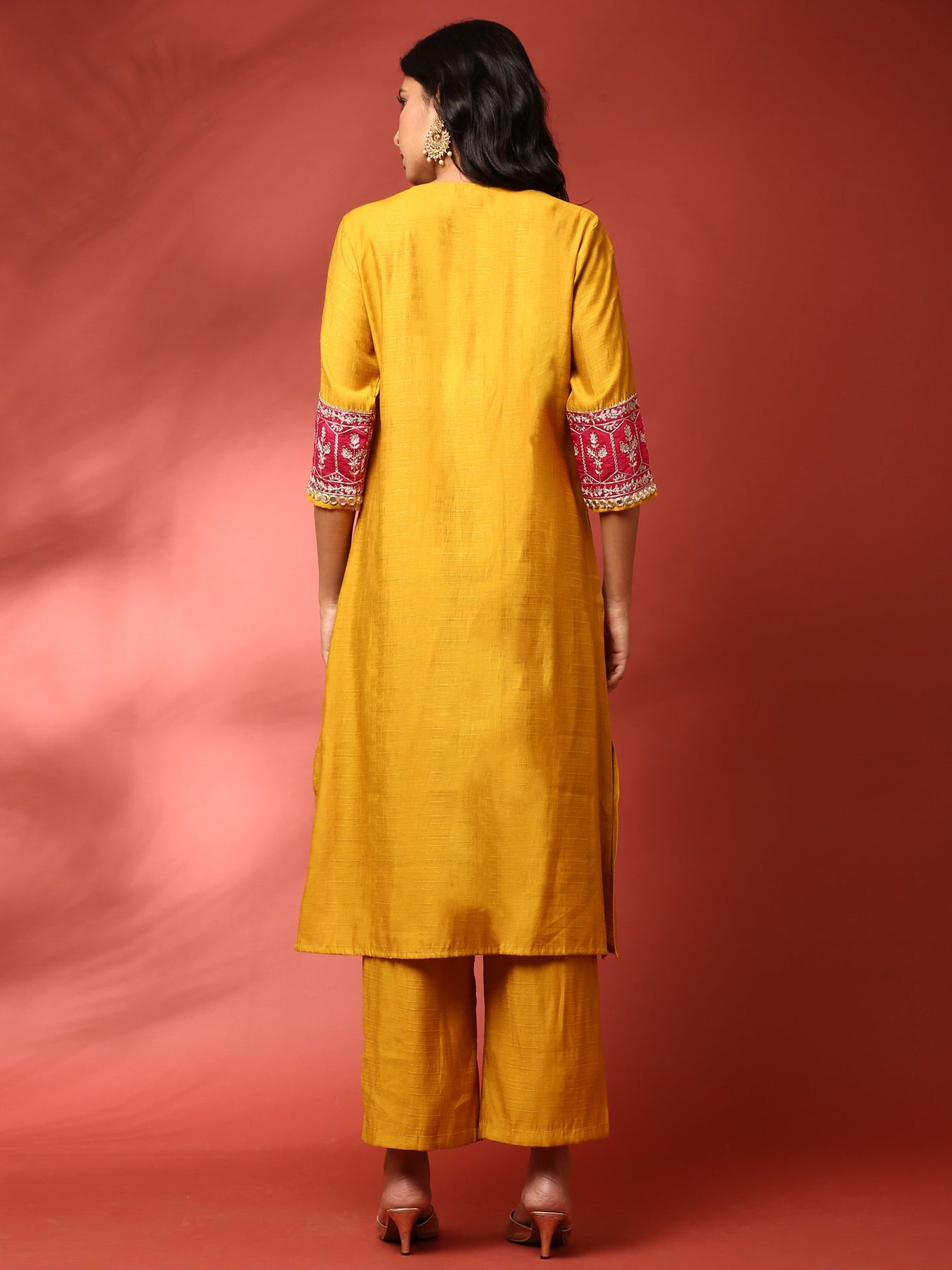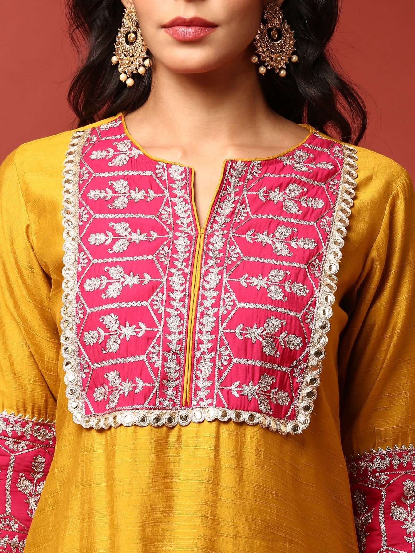 This elegant two-piece set features rich mustard and pink silk fabric adorned with detailed Aari embroidery, showcasing skilled craftsmanship. The harmonious blend of vibrant hues and intricate threadwork creates a sophisticated ensemble ideal for special occasions.