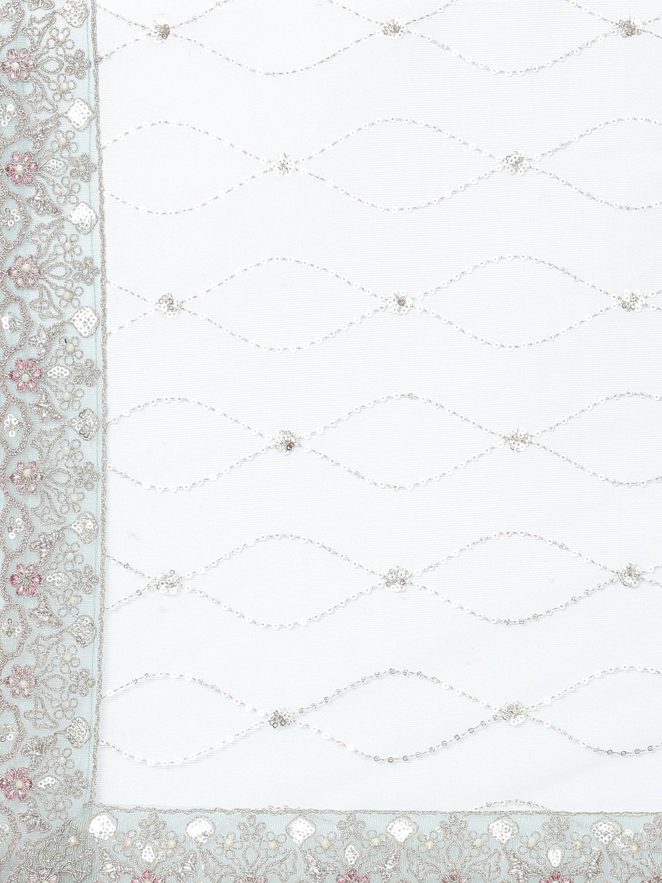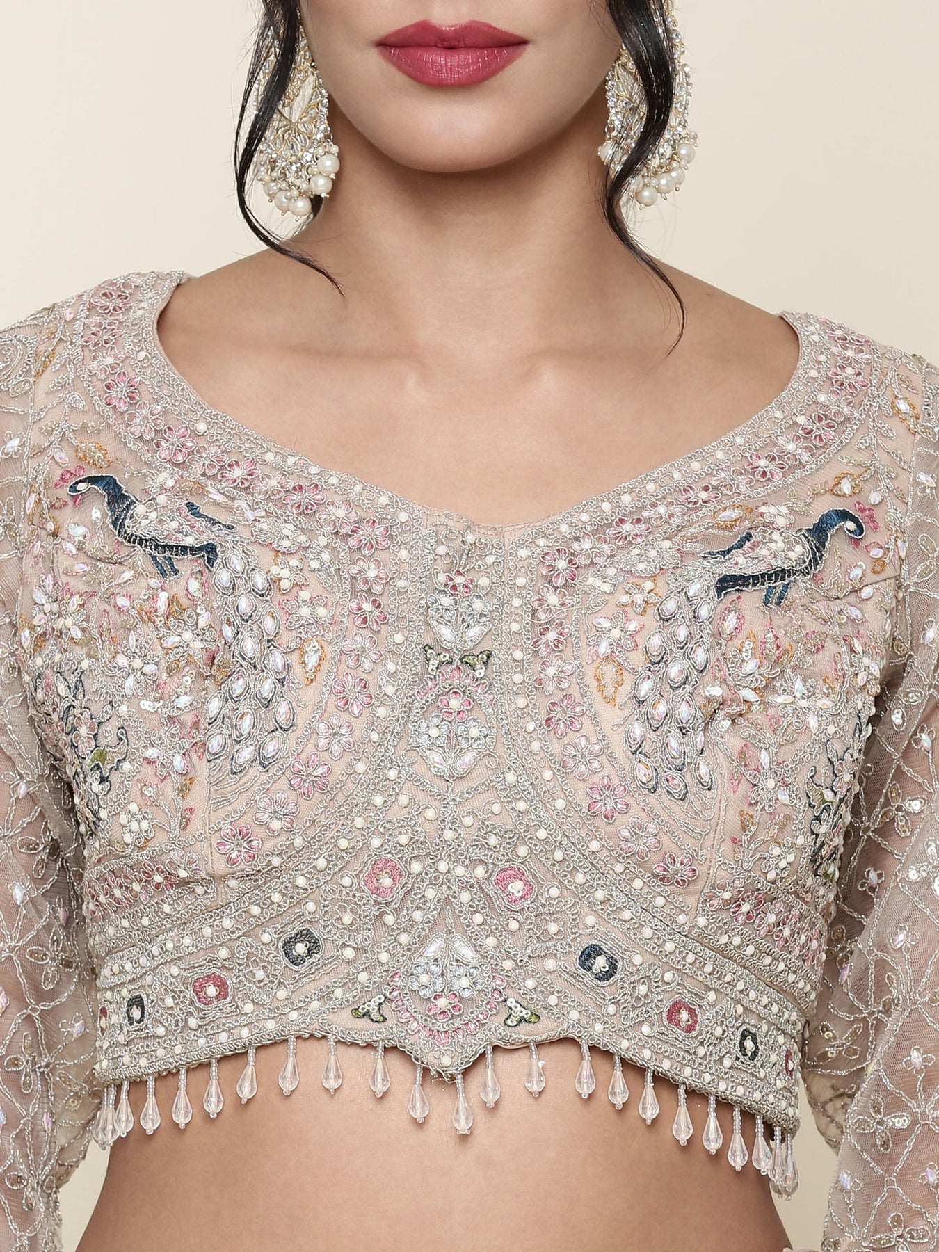 This beige net three-piece ghagra set features heavy embroidery that exemplifies expert craftsmanship and attention to detail. The net fabric provides a delicate, sheer base that complements the elaborate embroidery work, creating a sophisticated and elegant appearance. Designed for comfort and style, the set includes a matching blouse and dupatta, making it ideal for weddings and special celebrations.