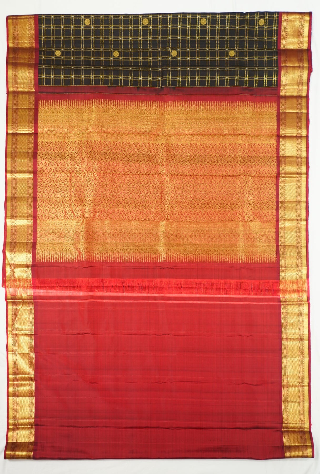 Elevate your ethnic wardrobe with this stunning Black Kanchi Pattu Zari Checks Handwoven Saree. Crafted using traditional handweaving techniques, this saree features intricate zari checks that add a touch of timeless elegance. The rich black base provides versatility for both festive occasions and formal gatherings, while the lustrous Kanchi Pattu fabric drapes beautifully. Perfect for those who appreciate authentic craftsmanship and classic Indian textiles, this saree celebrates heritage with every wear. An investment piece that transcends trends and complements your personal style effortlessly.