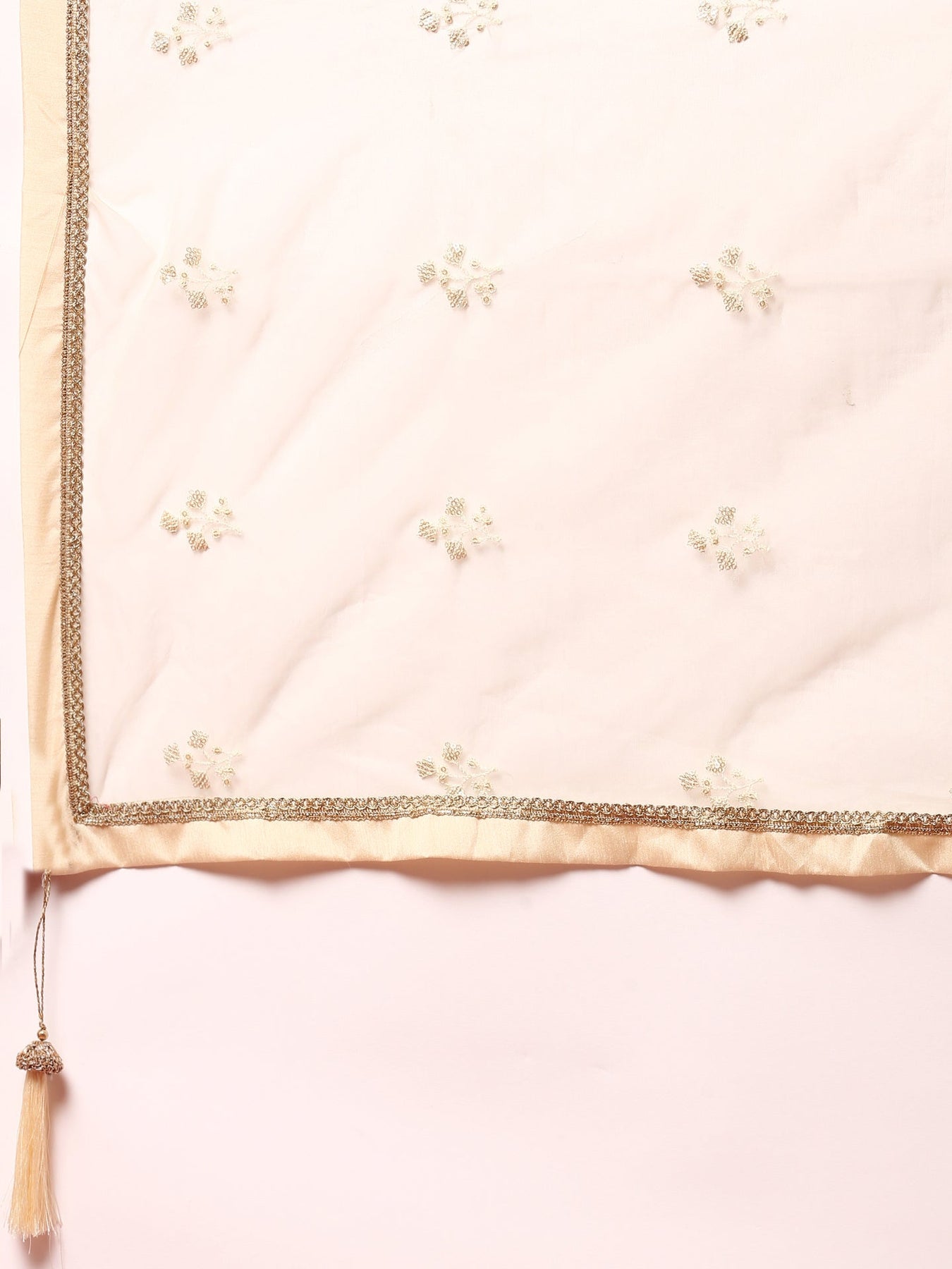 Elevate your ethnic wardrobe with this cream tissue fabric three-piece Anarkali set. The lightweight tissue fabric offers a delicate texture and comfortable fit, perfect for festive occasions or formal events. This set includes a gracefully flared Anarkali kurta, a matching churidar, and a coordinating dupatta, allowing for a cohesive and elegant look.