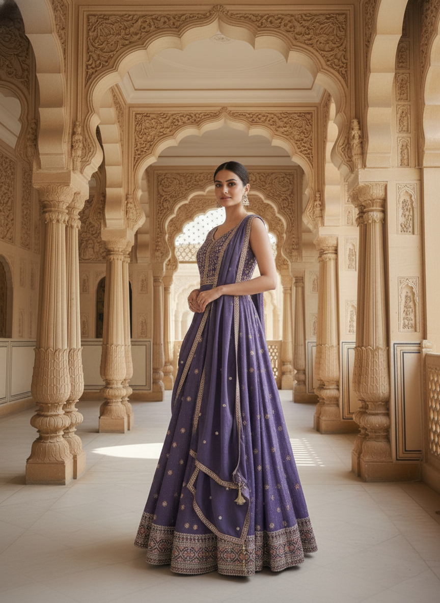 Elevate your ethnic wardrobe with this exquisite lavender Chinnon Anarkali set, a masterpiece of traditional craftsmanship. Each piece showcases intricate hand embroidery, meticulously crafted to create timeless elegance. The lightweight Chinnon fabric drapes gracefully, offering comfort without compromising on style. Perfect for weddings, festive celebrations, or special occasions, this set combines classic silhouettes with refined detailing. The soft lavender hue complements all skin tones, while the hand-embroidered embellishments add an unmistakable touch of luxury and sophistication to your ensemble.