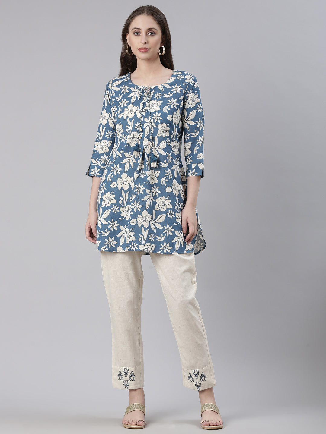 Elevate your everyday style with the Neerus Blue Casual Printed Kurti paired with matching trousers. Crafted for comfort and elegance, this ensemble features a graceful printed kurti in soothing blue tones, complemented by sleek trousers for a polished look. Perfect for casual outings or relaxed office days, it blends traditional charm with contemporary ease, enhancing your wardrobe with refined simplicity.