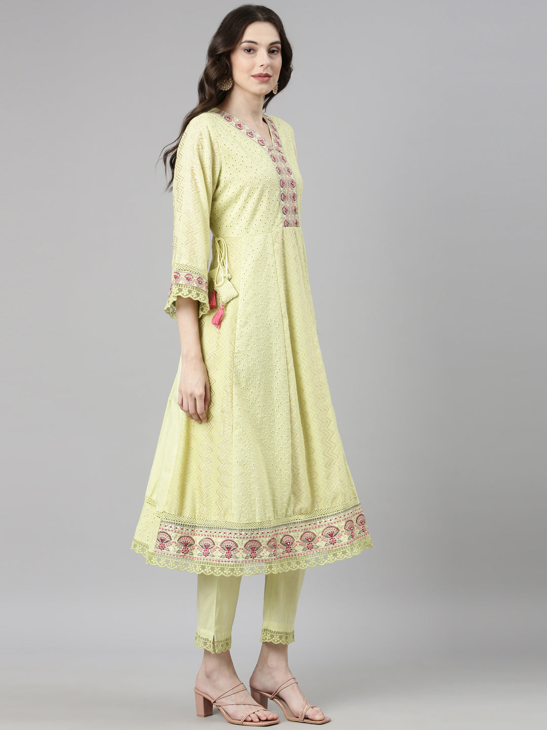 Neerus Yellow Casual Chevron Anarkali Kurta and Trousers With Dupatta