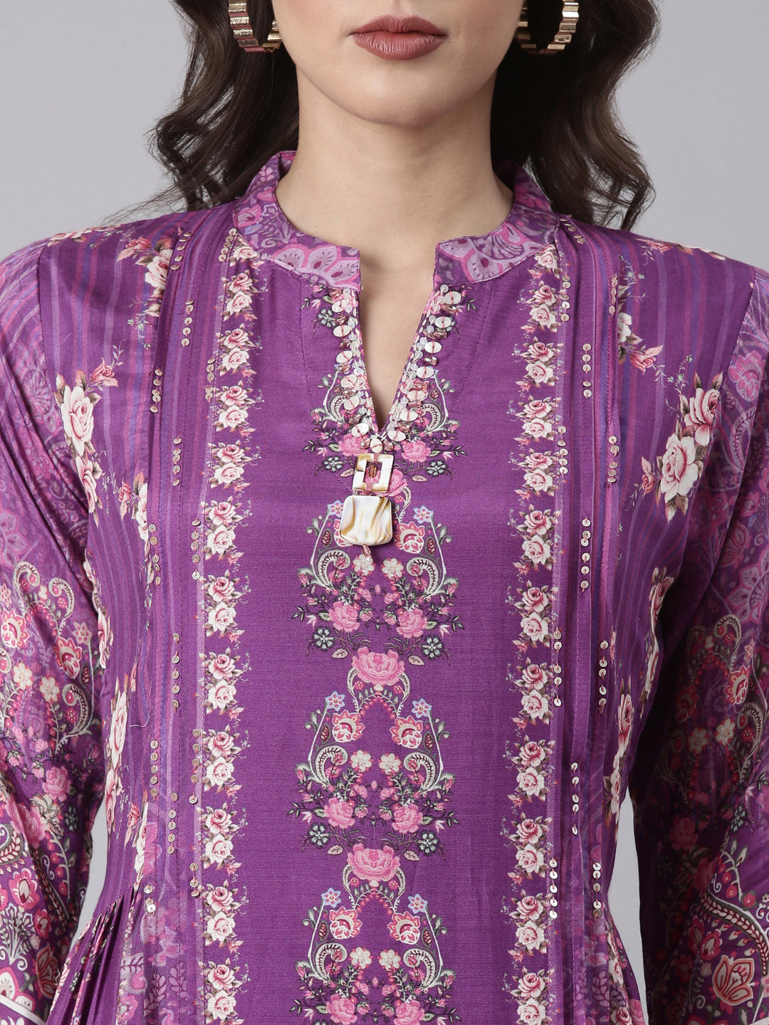 Crafted from soft muslin fabric, this purple printed one-piece gown offers a blend of comfort and elegance. Its long silhouette enhances gracefulness, making it suitable for both casual and semi-formal occasions. The breathable material ensures all-day comfort, while the intricate print adds a refined aesthetic touch. Ideal for those seeking effortless style