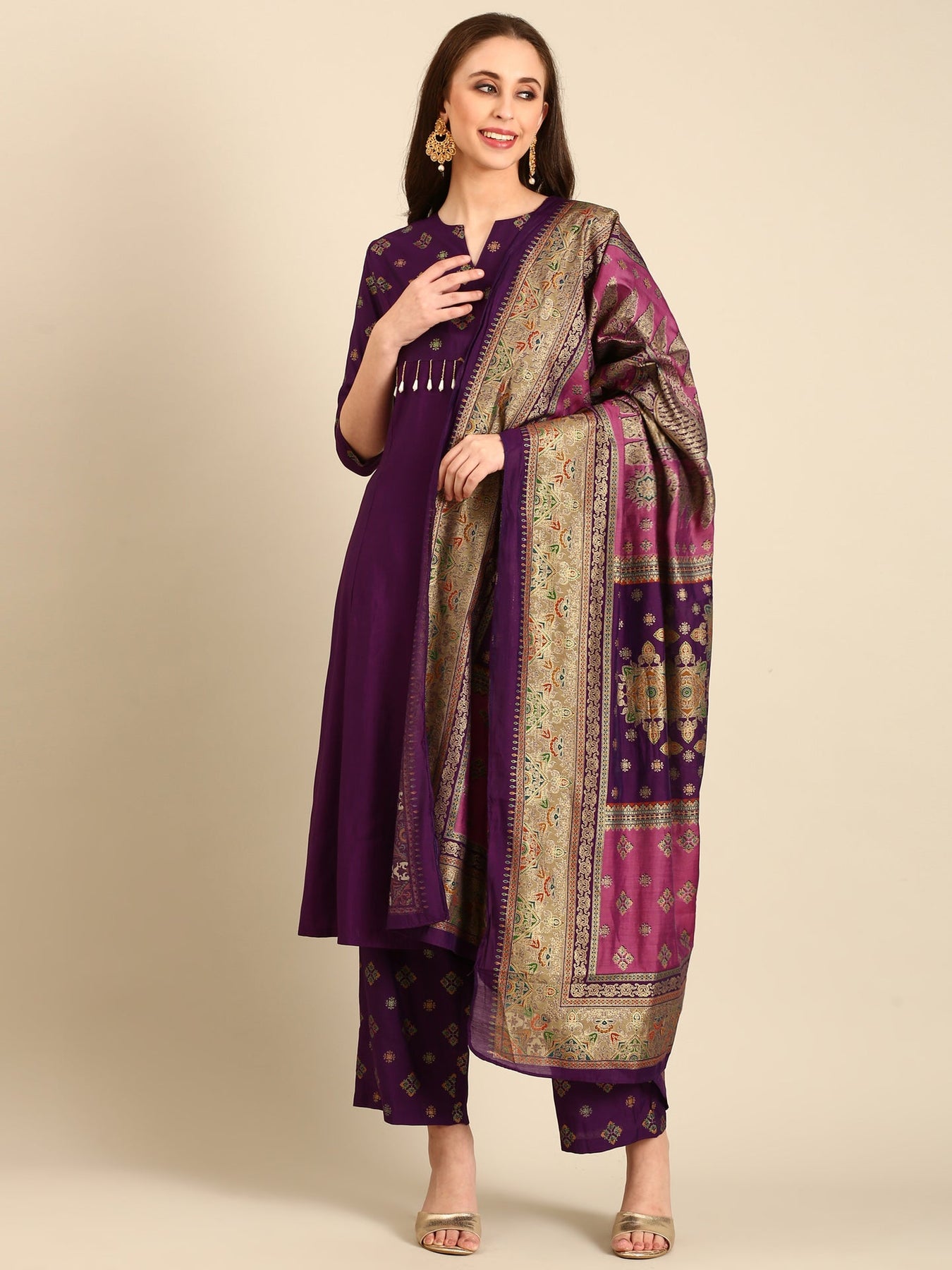Experience elegance with this Purple Muslin Suit featuring a beautifully crafted santoon fabric yoke and delicately printed sleeves. Complemented by an all-over printed Banarasi dupatta, it offers a perfect blend of comfort and traditional charm. Ideal for festive occasions or refined everyday wear, this ensemble ensures you stand out with timeless style and grace.